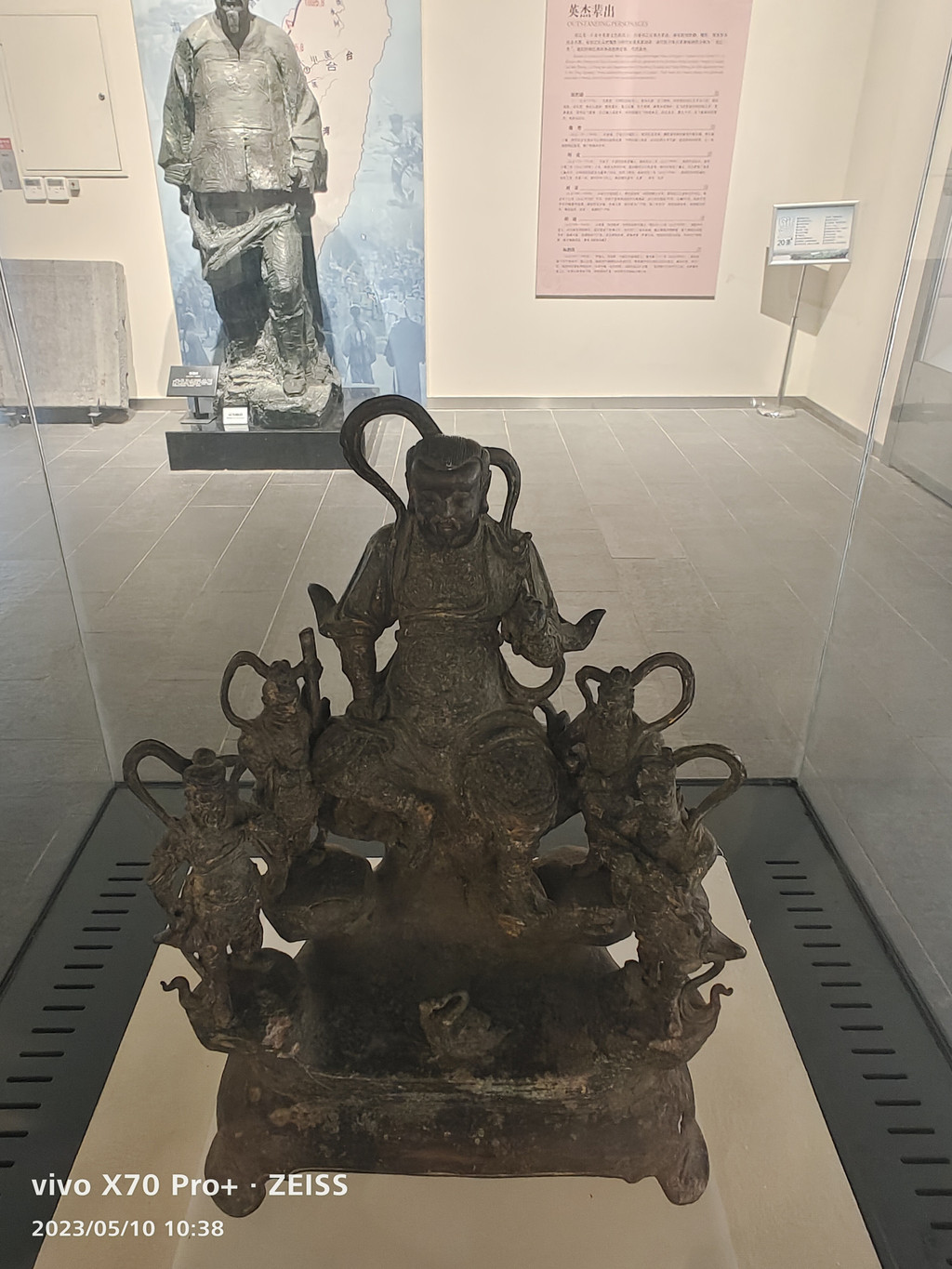 明嘉靖真武神铜造像长29厘米,宽16厘米,高42.2厘米。为真武神,多神合体,主神为真武大帝,助其降魔的四帅分列左右,前端为龟蛇灵兽,背部雕刻47字铭文:“寿州下蔡大山东信士马铠同子马儒等合家共发心奉请祖师并四帅等金火匠黄柏嘉靖四十一年十一月十五日请”。据铭文可知该铜造像为嘉靖四十一年寿州信士马氏父子一家所请。器物保存完好,组合完整,纪年准确,是明朝真武信仰的实物见证。