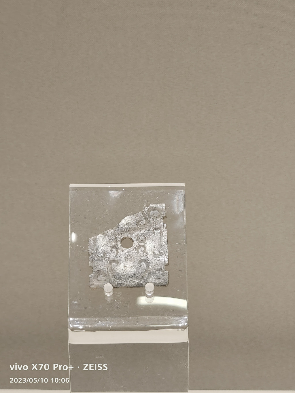 陈列在该馆展柜中的这枚韘形白玉佩,长0.8cm、宽5.2cm、厚0.3cm。通体纯洁无瑕,两侧透雕连体螭龙,形体修长,线条流畅,在灯光的照射下,显得精妙绝伦。