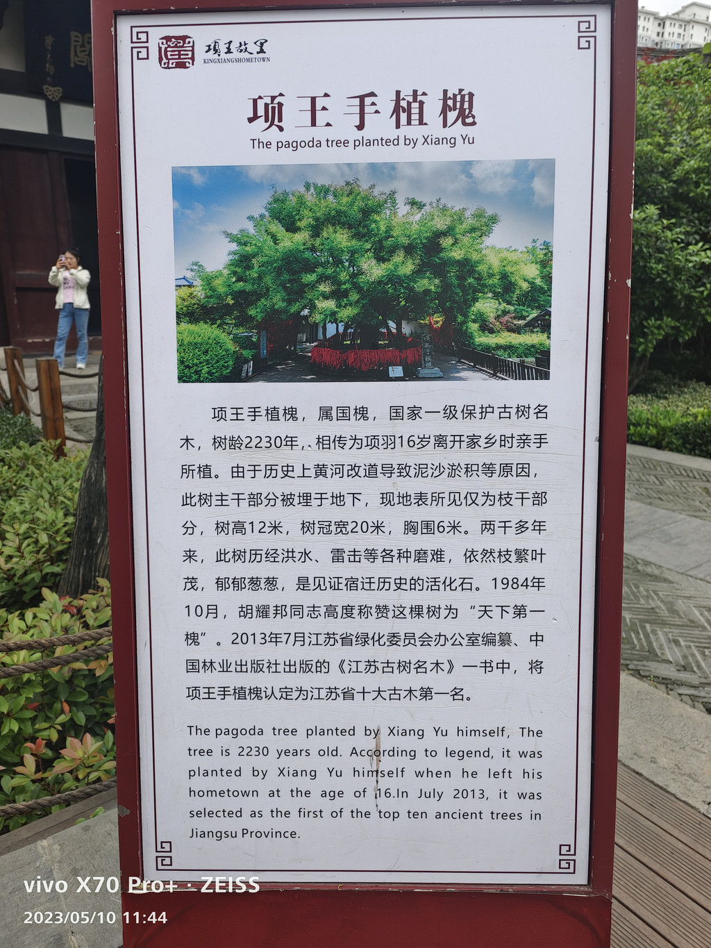 2023年5月10日中午11点看完宿迁博物馆,出门往南不远就是项王故里,原本以为项王故里应该在郊外一个地方,没想到景区竟在市中心,该不是重建的仿古景区吧。项王景区门票不菲,每人80元,不过老年人还是有优惠,70岁以上免票。
