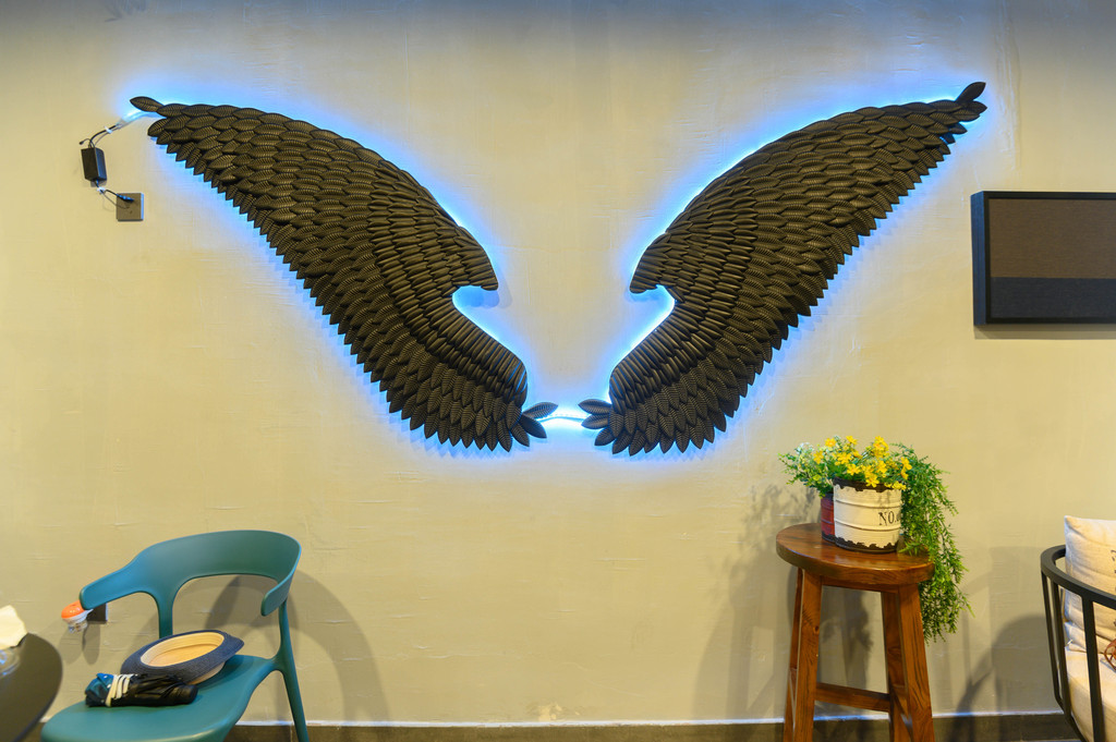 走进“书房”,一对黑色天使之翼出现了,原来这里是家咖啡馆。