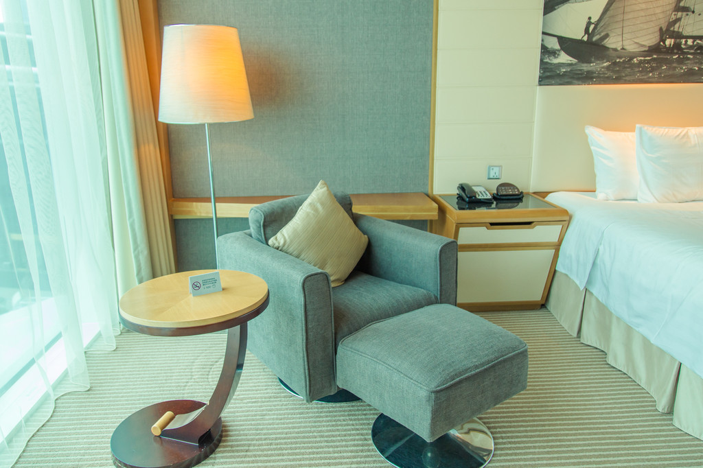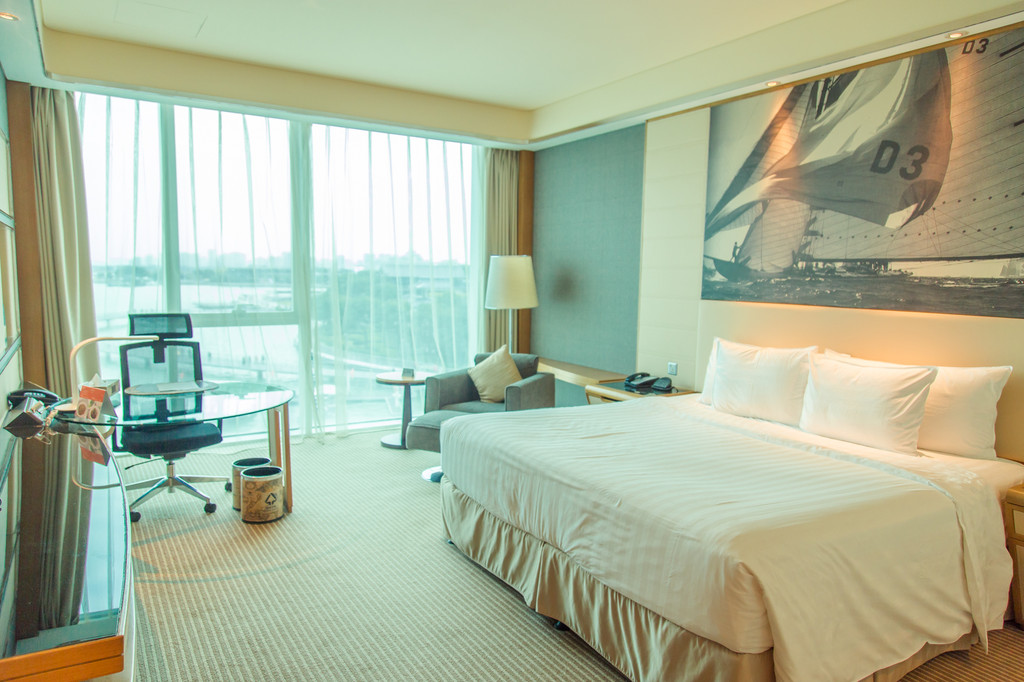 不光是外观像邮轮,酒店的室内也是邮轮式的格局。推开房门是典雅的客房,充满现代气息和邮轮元素,落地窗外金鸡湖湖光尽收眼底。房间宽敞明亮,非常舒适。