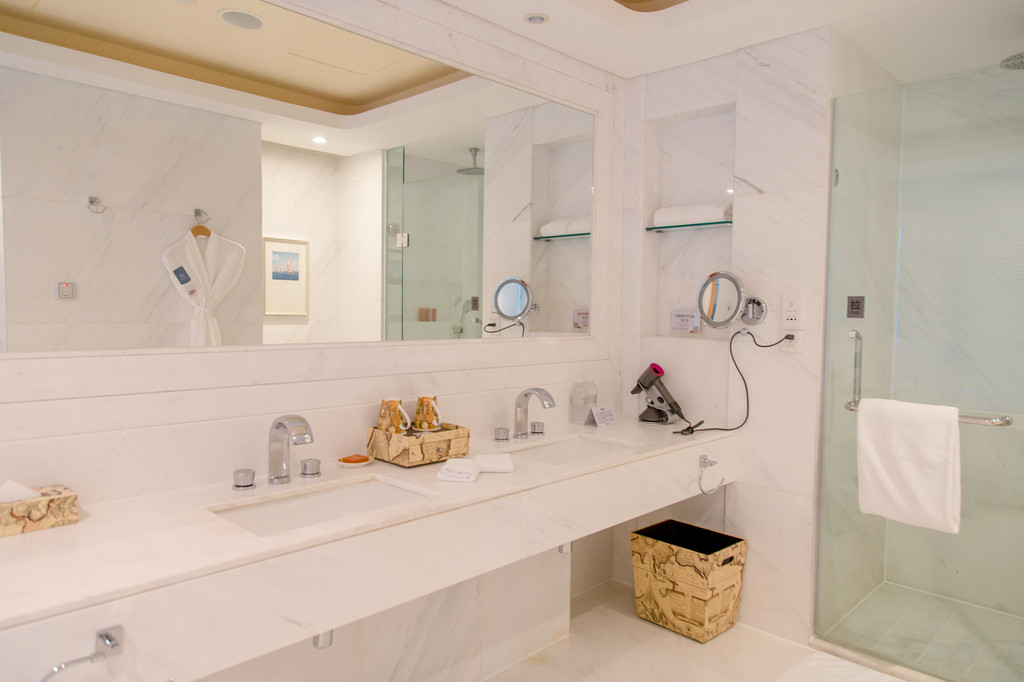 五星标配的设施设备齐全,保险柜,小吧台,冰箱......空间足够大的洗手间是双洗手台,一家四口的我们一起洗漱,都不会觉得拥挤。马桶是智能的,吹风机是戴森的,洗浴用品是意大利BORGHESE特别定制款,着实高大上。坐在窗口的办公桌前,渴望自己有一天也能拥有这样的温馨小家。