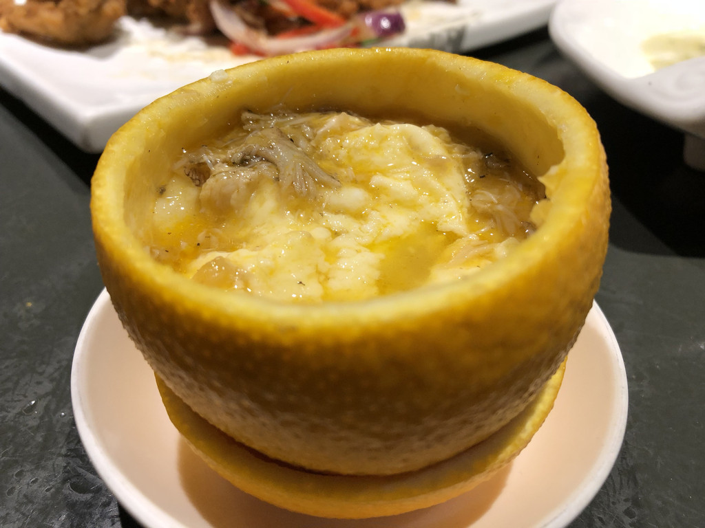 所以要想尝鲜又不想动手剥蟹的话,最好选以现拆蟹粉入馔的店家,比如洋洋饺子馆总店这道18元的鲜橙蟹蒸蛋,仅放了少许蟹腿肉,就鲜香无比,与酸甜的橙汁和嫩滑的蒸蛋相辅相成,色、香、味、型俱全,算得上以少胜多的实例。