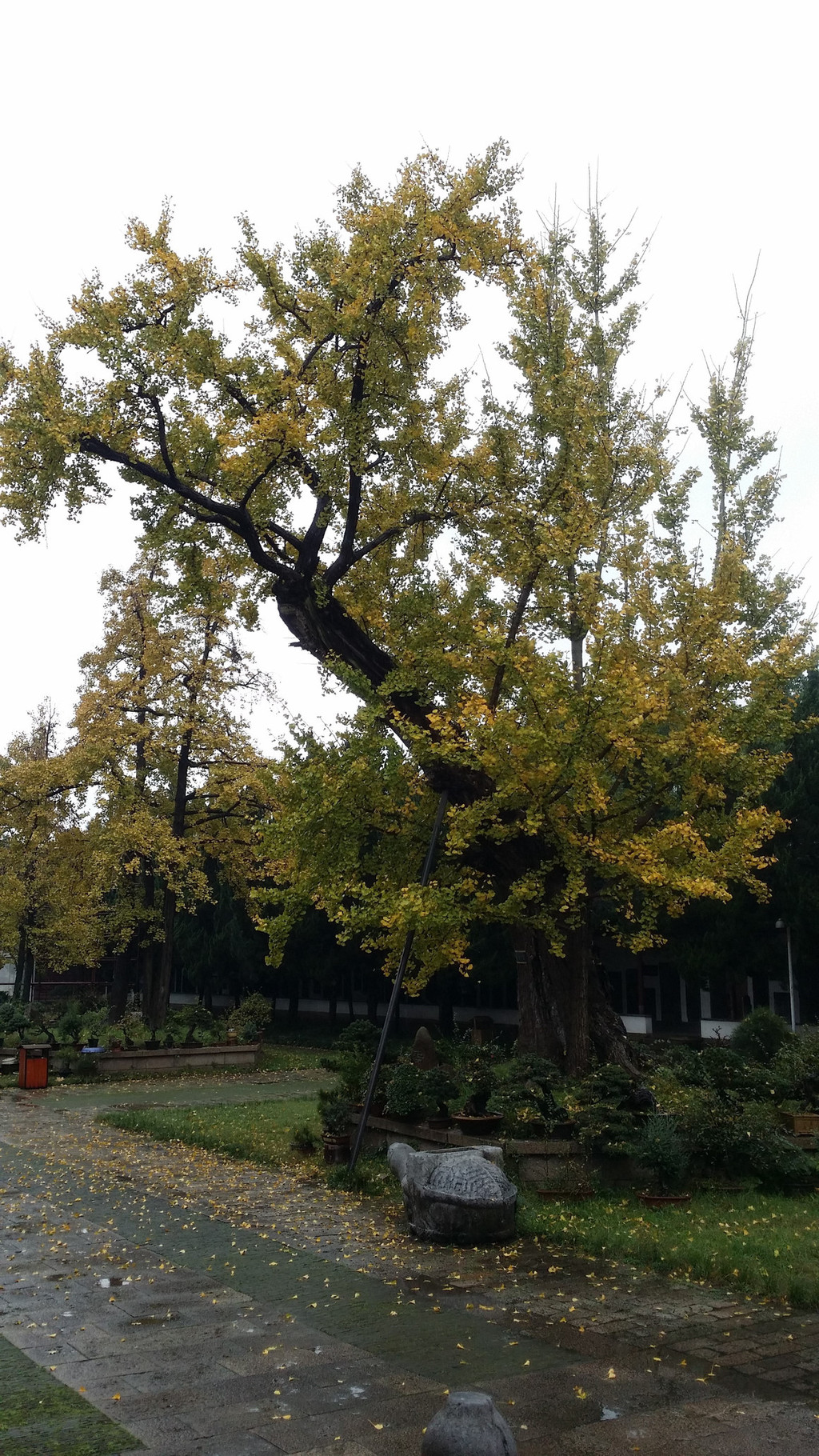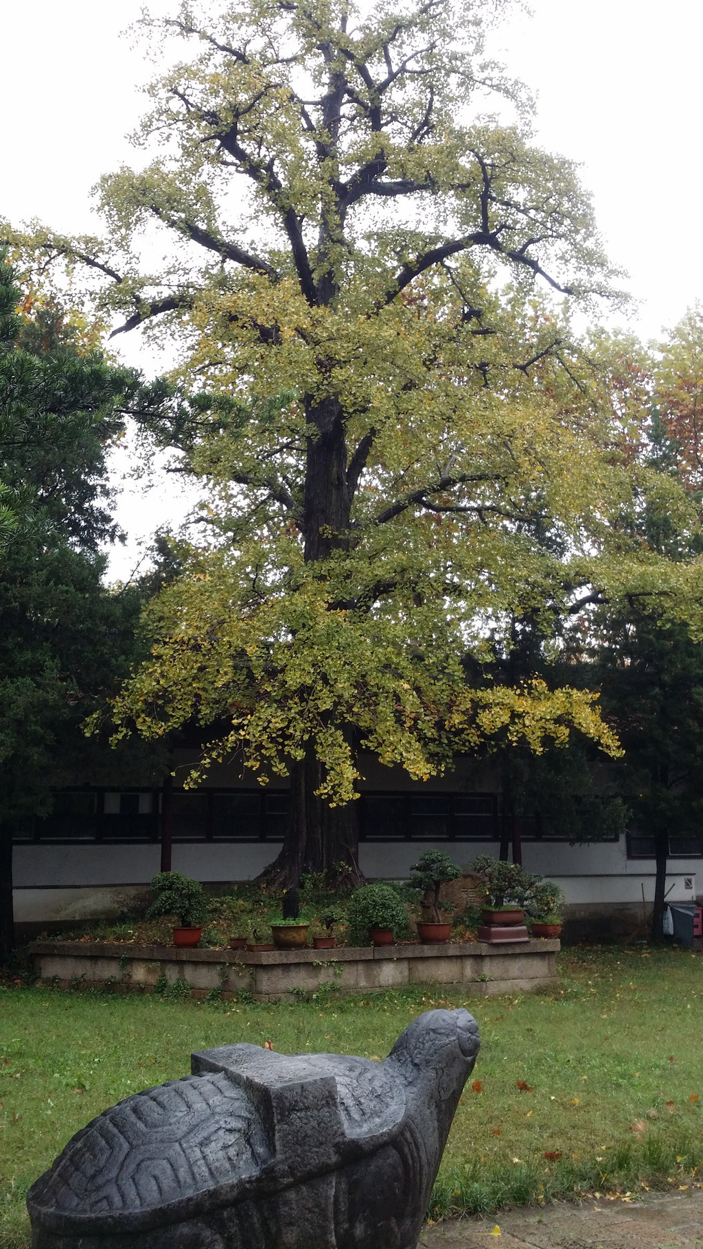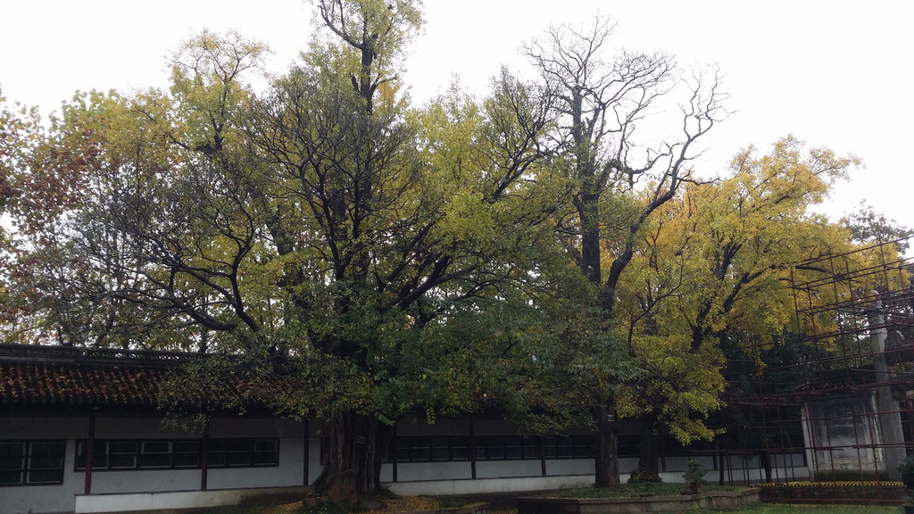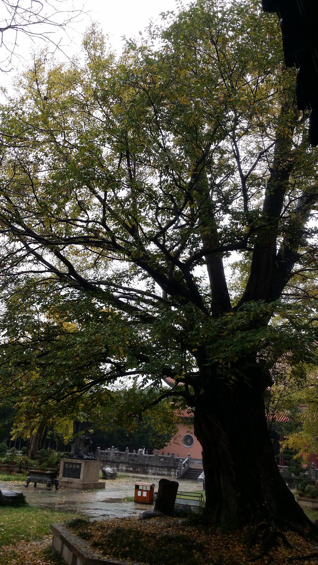 院里有四棵800多年树龄、植于南宋的银杏。下图左侧是连理杏,乍一看怎么会是银杏树呢?挂错牌子了吧?仰头看树干和树叶,明明是另一种树嘛!站远了再往最上方看,原来是两枝银杏被第三棵树抱住,后者开枝散叶遮挡了来自树下的视线。不知这是否说明了三儿的强大力量。