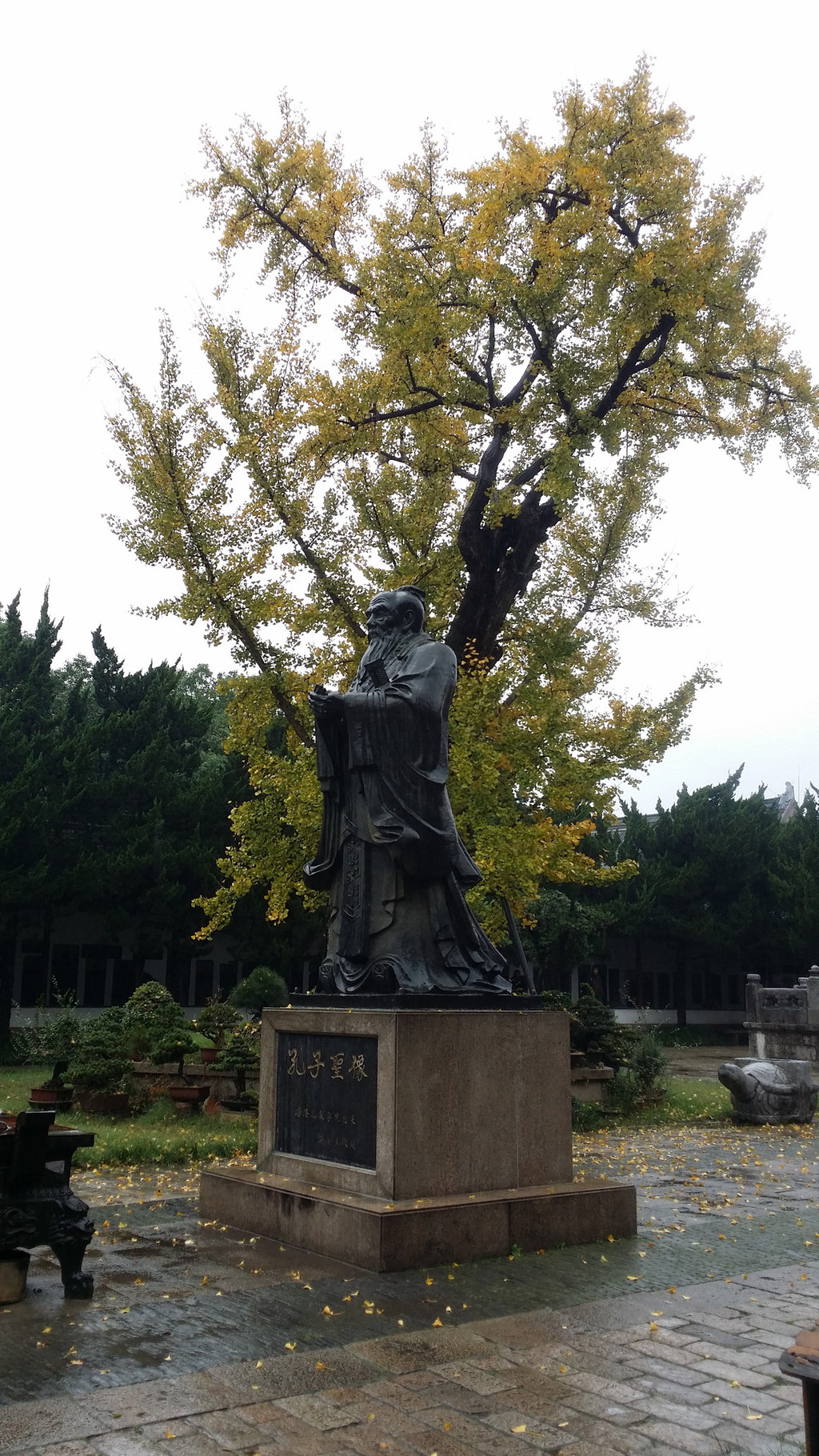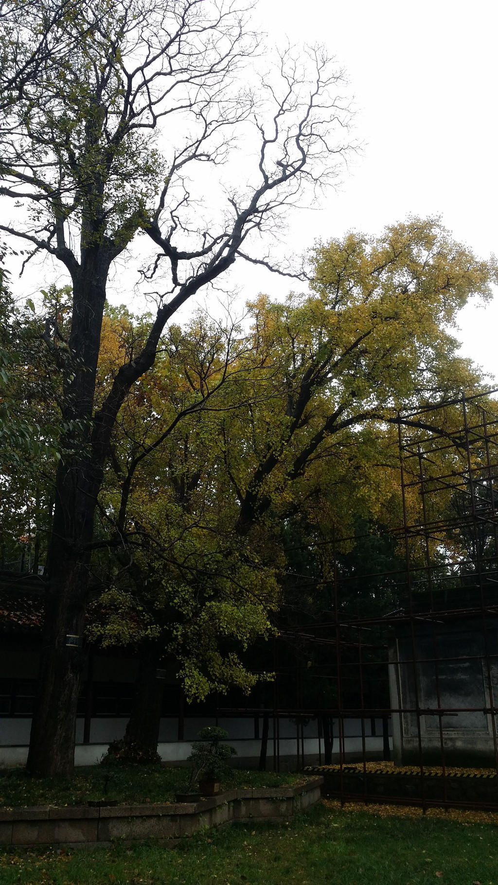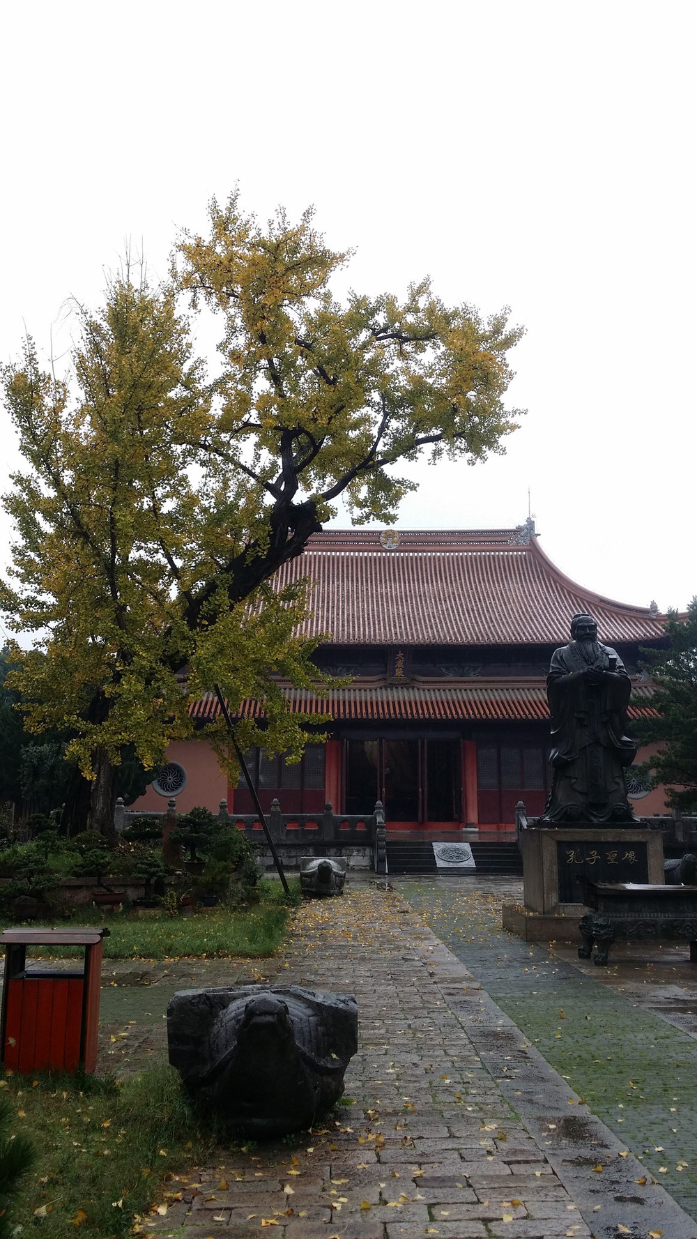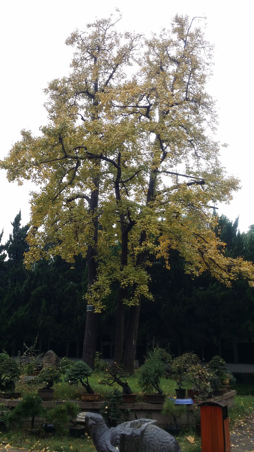 院里有四棵800多年树龄、植于南宋的银杏。下图左侧是连理杏,乍一看怎么会是银杏树呢?挂错牌子了吧?仰头看树干和树叶,明明是另一种树嘛!站远了再往最上方看,原来是两枝银杏被第三棵树抱住,后者开枝散叶遮挡了来自树下的视线。不知这是否说明了三儿的强大力量。