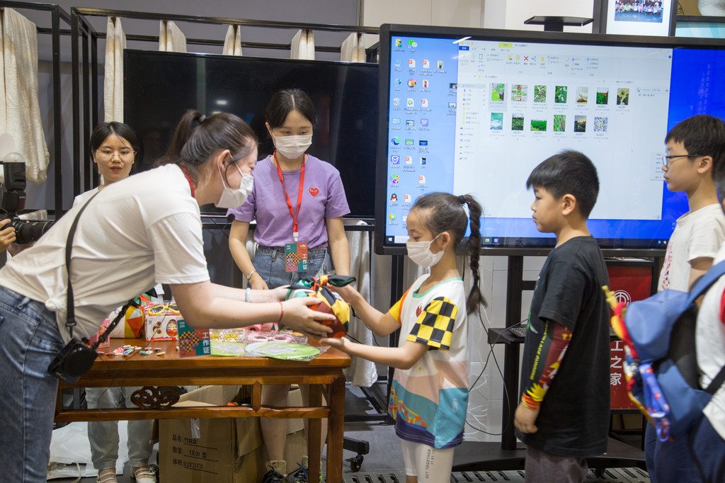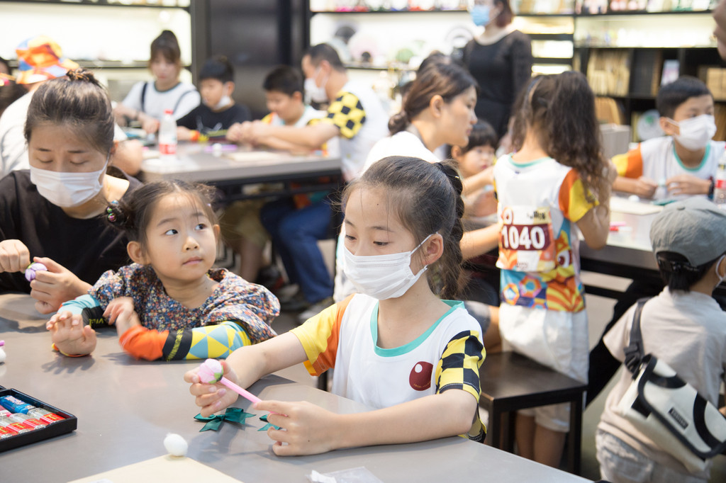 最后在老师的带领下,每个小朋友都用蚕茧手工制作了一朵永生花,拿热熔胶粘在水笔上,成了这次旅行最有意义的纪念品。现场还能看到很多用蚕茧制作的手工艺,精致又精美。