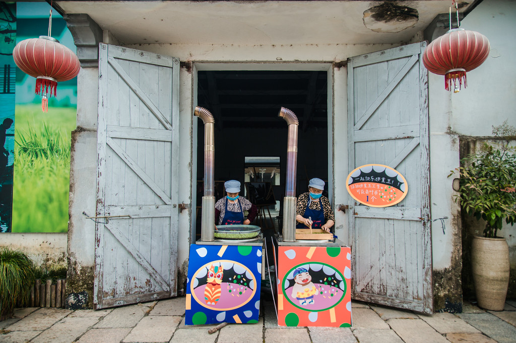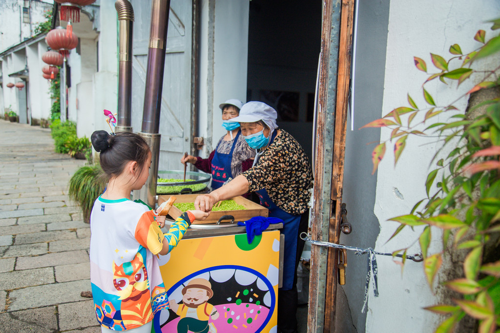 第一站,打卡阿婆团子,这是震泽美食之一,宝贝们可以用两个桑叶币换一个团子哦。没吃早餐的我,肚子咕咕再叫,可是宝贝女儿舍不得桑叶币,不换给我吃。