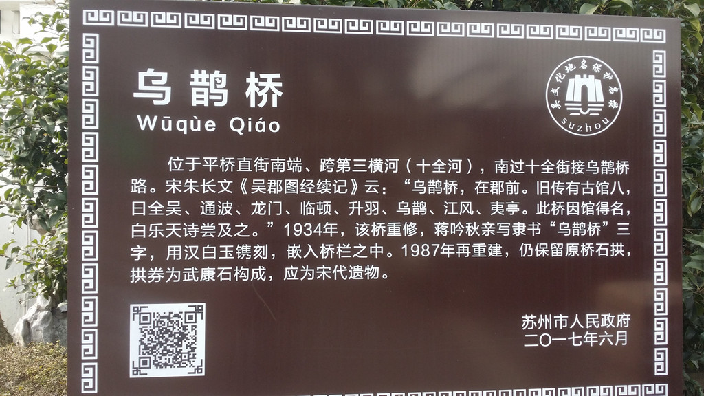 唐代白居易任苏州刺史时,乌鹊桥也曾入诗: “馆娃宫深春日长,乌鹊桥高秋夜凉”、“阖闾城碧铺秋草,乌鹊桥红带夕阳”、“黄鹂巷口莺欲语,乌鹊河头冰欲销”。《水浒传》中宋江征方腊,武松在桥下也立过战功……
