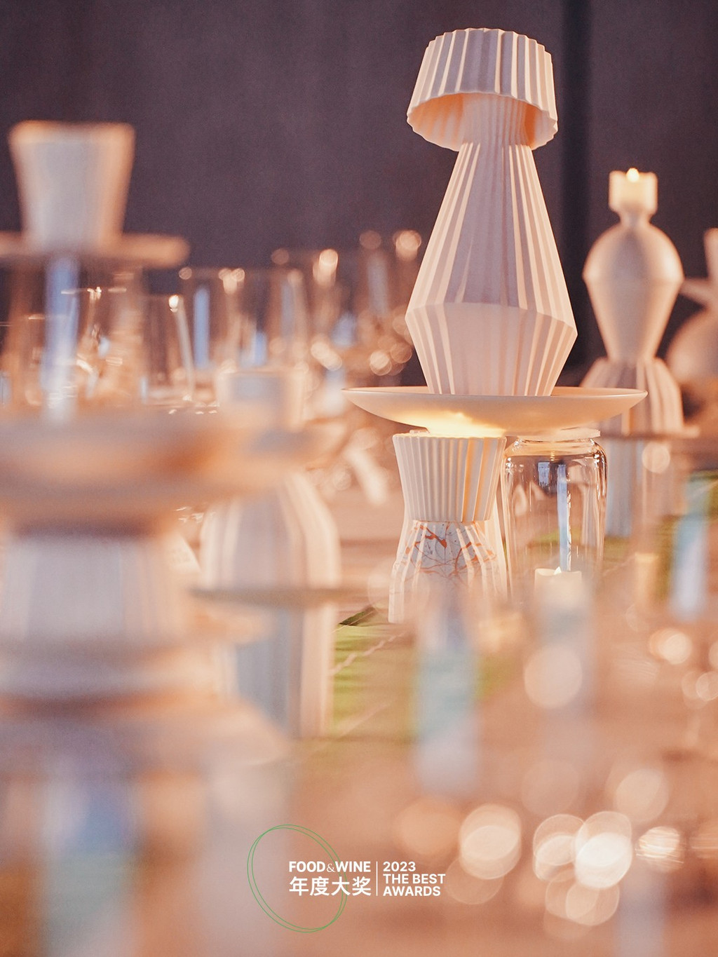 延续第一届「FOOD&WINE 年度大奖」,陶瓷工作室「ERRANCE 出走」的两位艺术家黄祎洁、陈翔为本届大奖特别设计了奖杯。沿用解构手法,奖杯设计尝试打破水平堆叠,利用斜面错位,结合主视觉中盘子层层堆叠上升的概念,塑造块与面之间的张力。这种「破」与「立」的紧张感,恰合「新竞技场」的主题。同时,为践行社会责任,第二届「FOOD&WINE 年度大奖」晚宴餐桌布置选择以陶瓷器物置景代替鲜切花束,同样由陶瓷工作室「ERRANCE 出走」完成创作。
