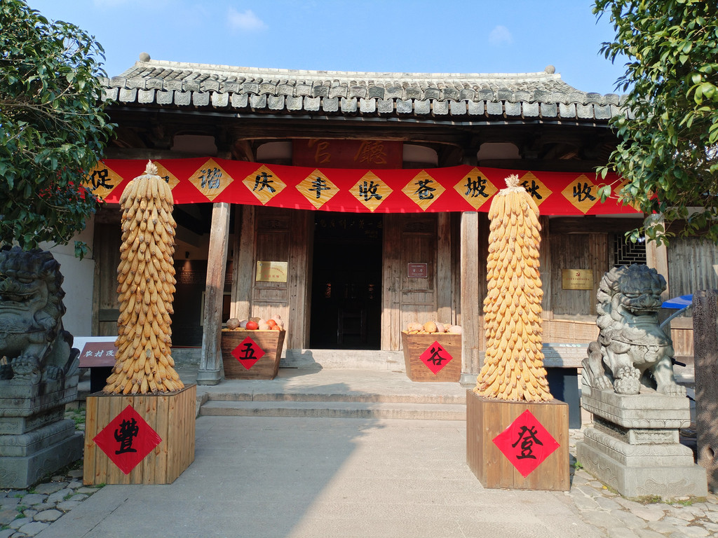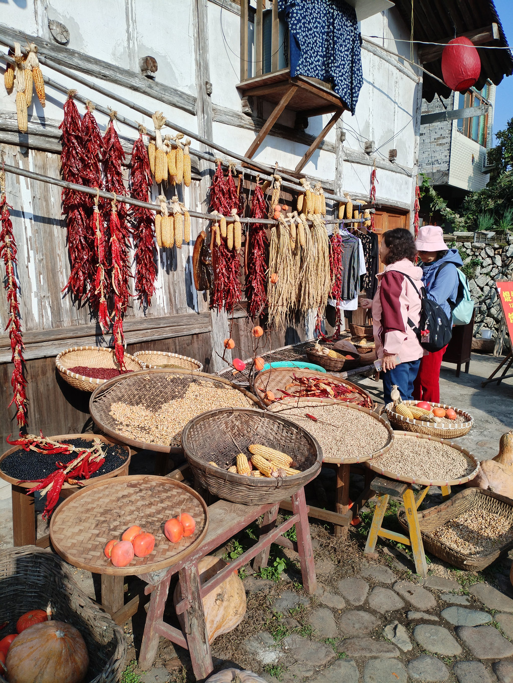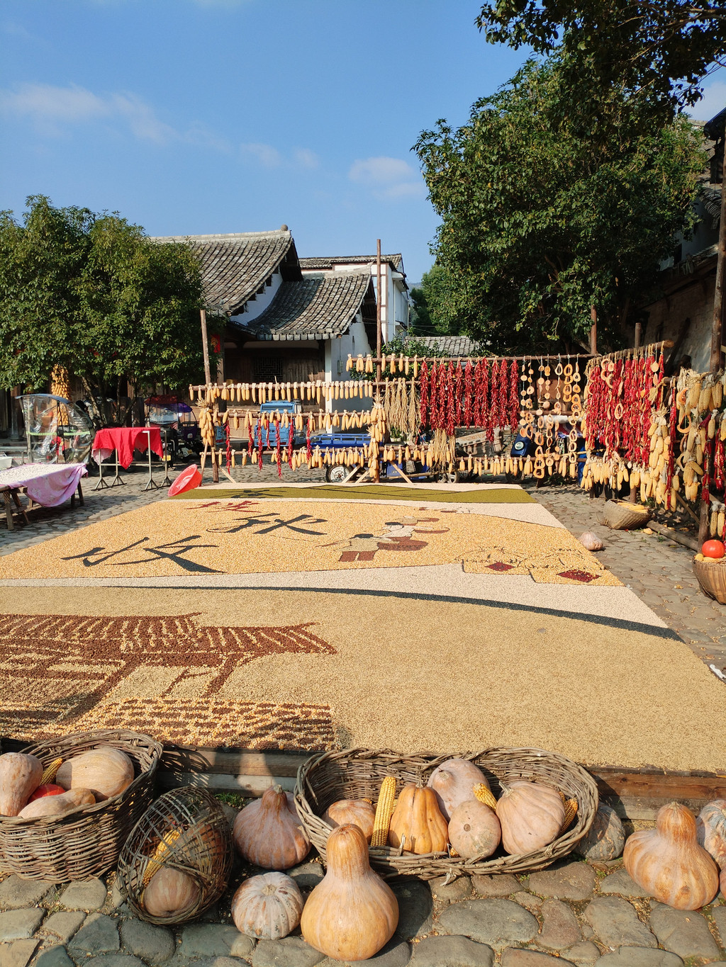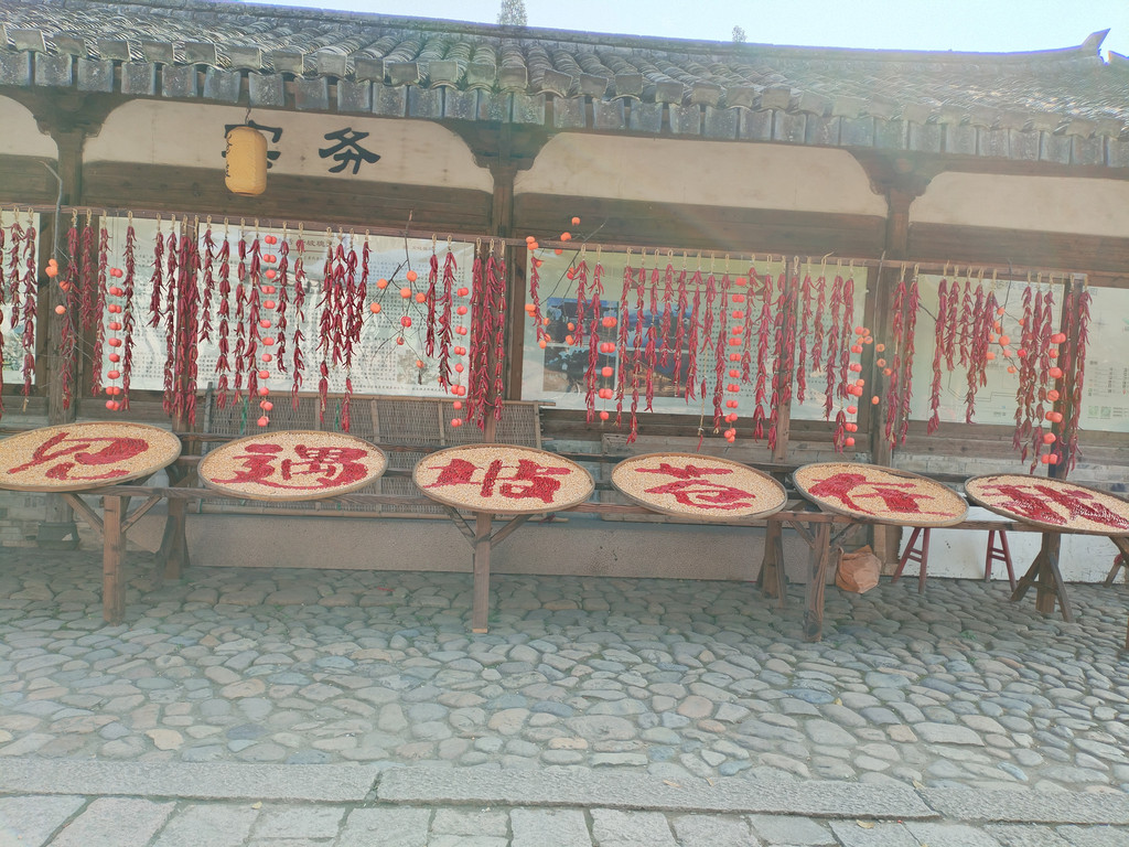 位于温州永嘉的苍坡古村,背依笔架山,面对楠溪江。村落格局基本保持南宋时期的规划原状与建筑风貌。它的布局理念独特,源自文房四宝:直指笔架山的东西走向的中心街是“笔”,东西两个池塘是“砚”,两个池塘边靠近笔街的地方各放置一大条石,是“墨”,而方正的村落如同一张田字格的“纸”。我们是下午去苍坡古村的,当时阳光朗照,古村里正在晒秋:红辣椒、黄玉米、红黄南瓜、红柿子、红薯干、手工面等,或悬挂在柱上墙上架上,或平摊在簸箕木板垫子上,辣椒、豆子和玉米还拼成很多祝福的话语。漫步在古村里,丰收的喜悦自然而然地涌上了心头。
