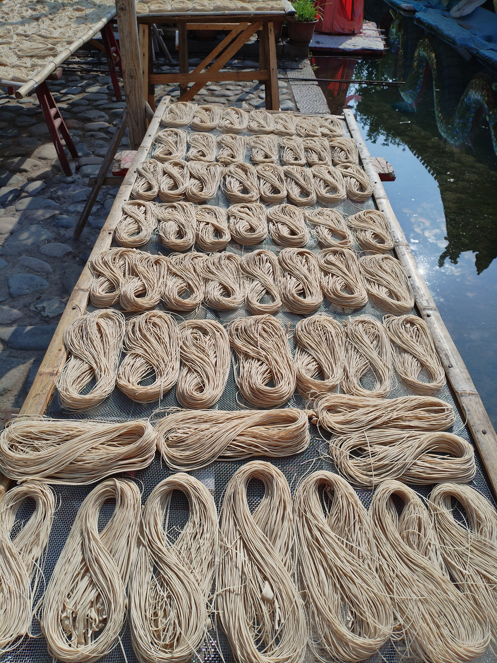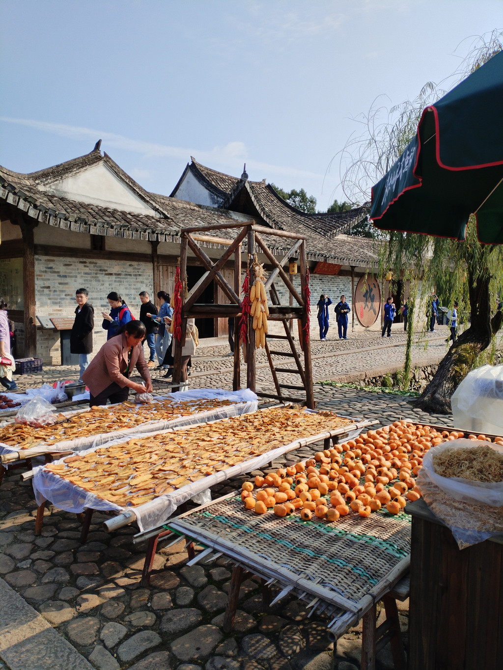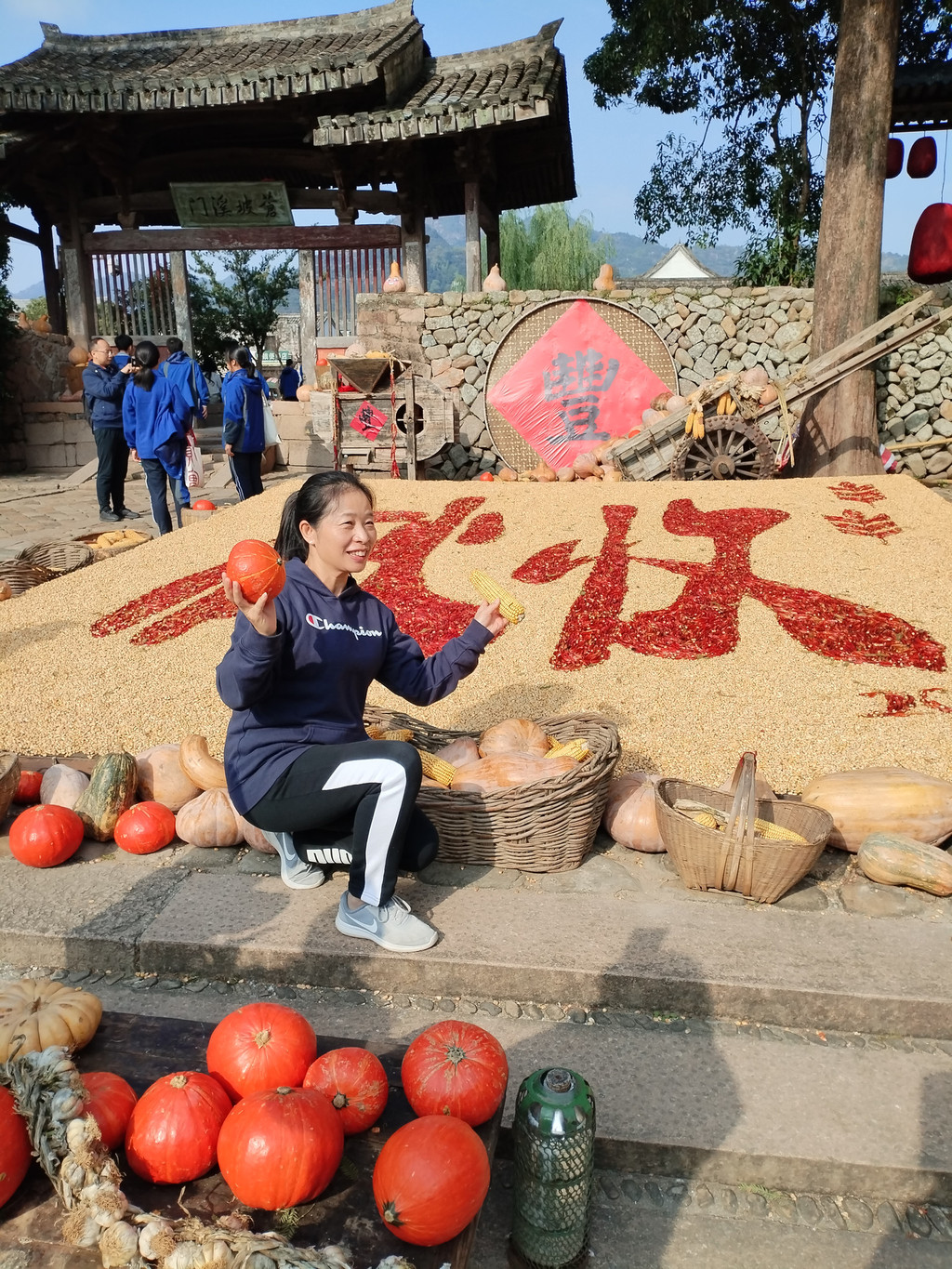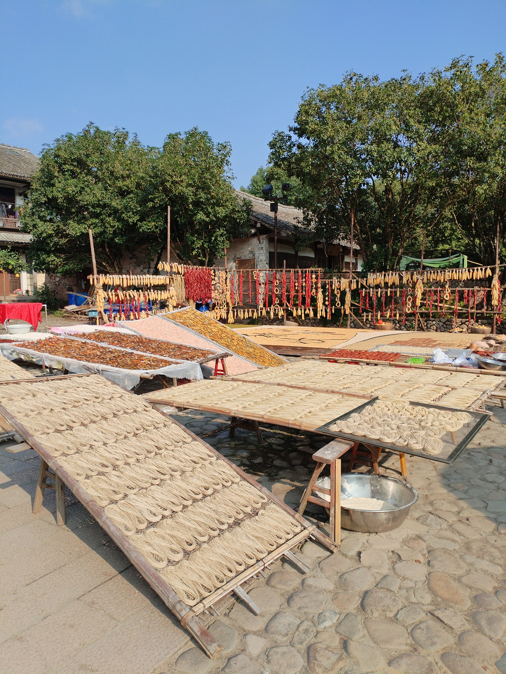 位于温州永嘉的苍坡古村,背依笔架山,面对楠溪江。村落格局基本保持南宋时期的规划原状与建筑风貌。它的布局理念独特,源自文房四宝:直指笔架山的东西走向的中心街是“笔”,东西两个池塘是“砚”,两个池塘边靠近笔街的地方各放置一大条石,是“墨”,而方正的村落如同一张田字格的“纸”。我们是下午去苍坡古村的,当时阳光朗照,古村里正在晒秋:红辣椒、黄玉米、红黄南瓜、红柿子、红薯干、手工面等,或悬挂在柱上墙上架上,或平摊在簸箕木板垫子上,辣椒、豆子和玉米还拼成很多祝福的话语。漫步在古村里,丰收的喜悦自然而然地涌上了心头。