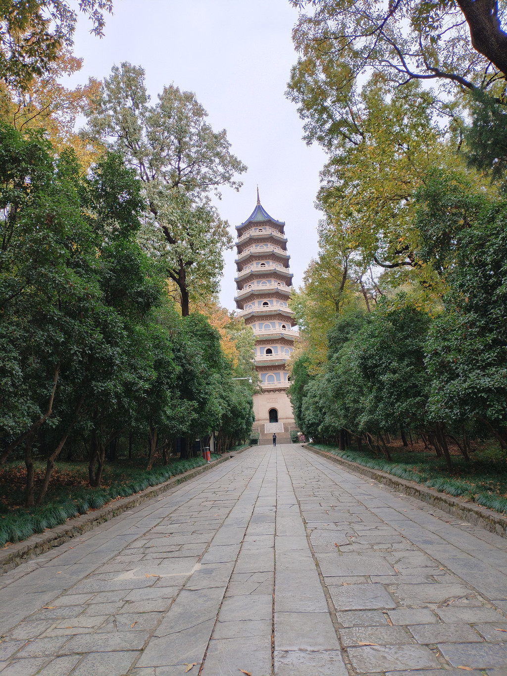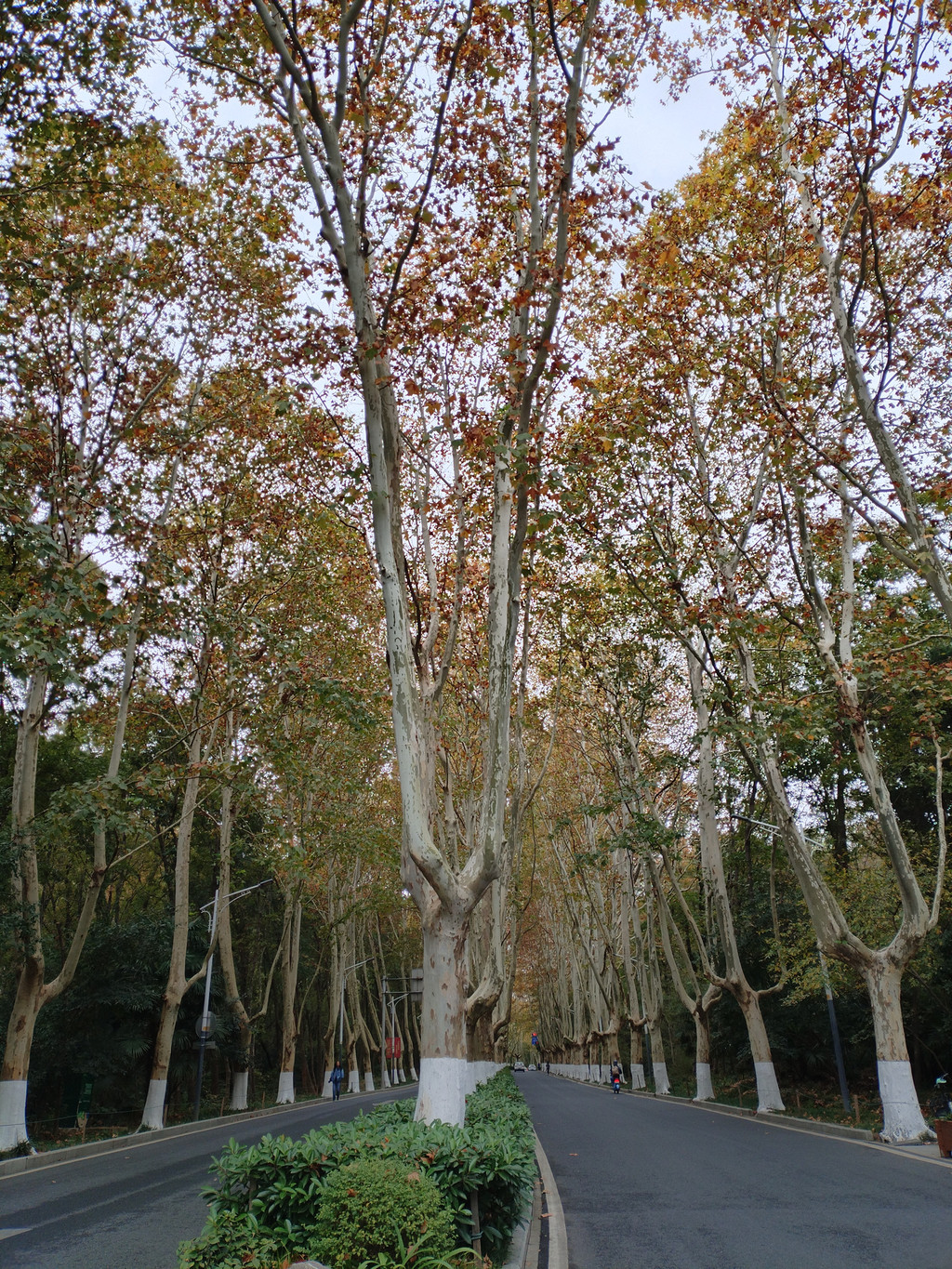 位于钟山东麓的灵谷景区,梧桐和银杏满树金黄,枫树和乌桕红叶满枝。站在灵谷塔上远眺,钟山的满坡树林颜色五彩缤纷。
