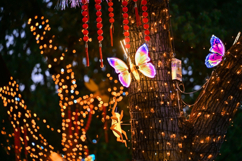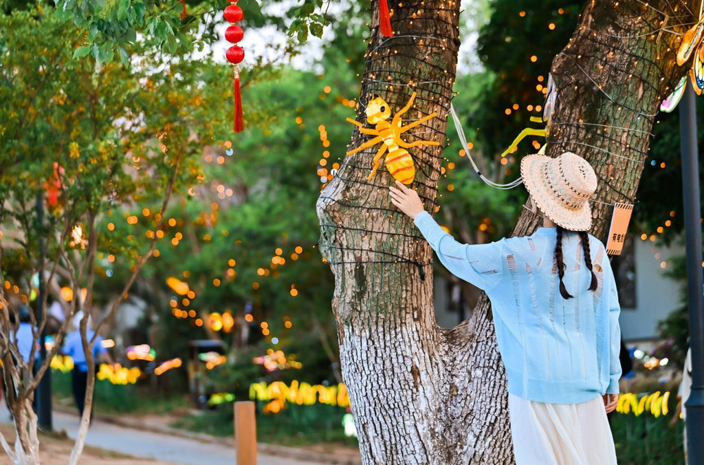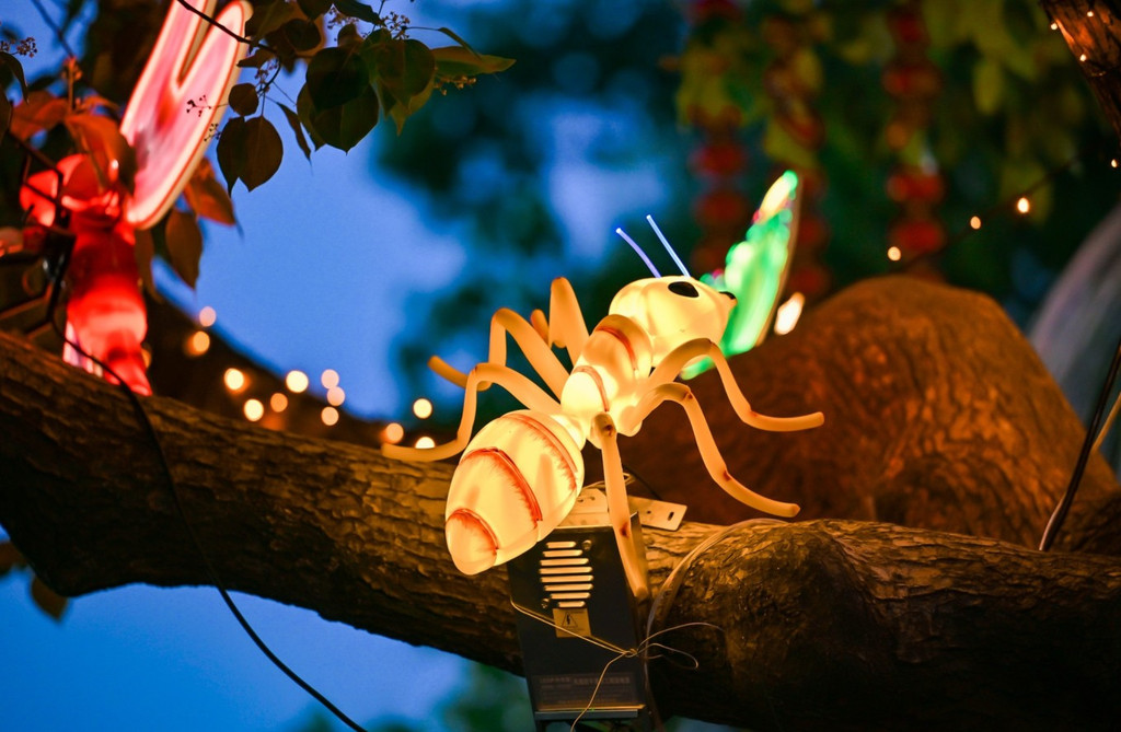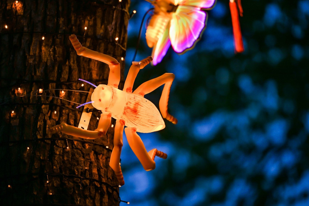 景区山林小径化身为夜光森林,利用灯光技术打造出昆虫主题景观,萤火虫灯在枝叶间闪烁,蝴蝶灯、蜻蜓灯、瓢虫灯等各种昆虫造型的灯点缀像童话,每一个昆虫灯都贴心写了介绍,非常适合低龄宝宝来这里认识昆虫,梦幻的灯光一定能让小朋友对昆虫充满兴趣,美好的森林和夏日的晚风,是这个五一假期难忘的记忆。