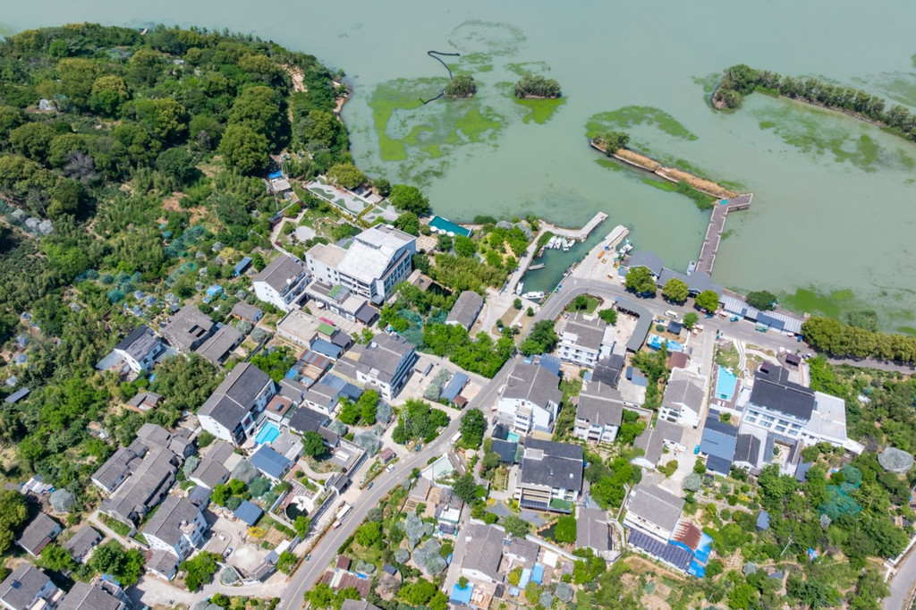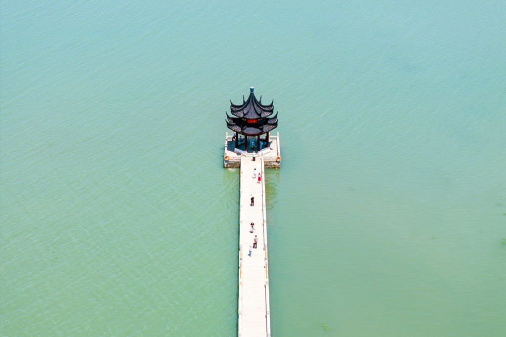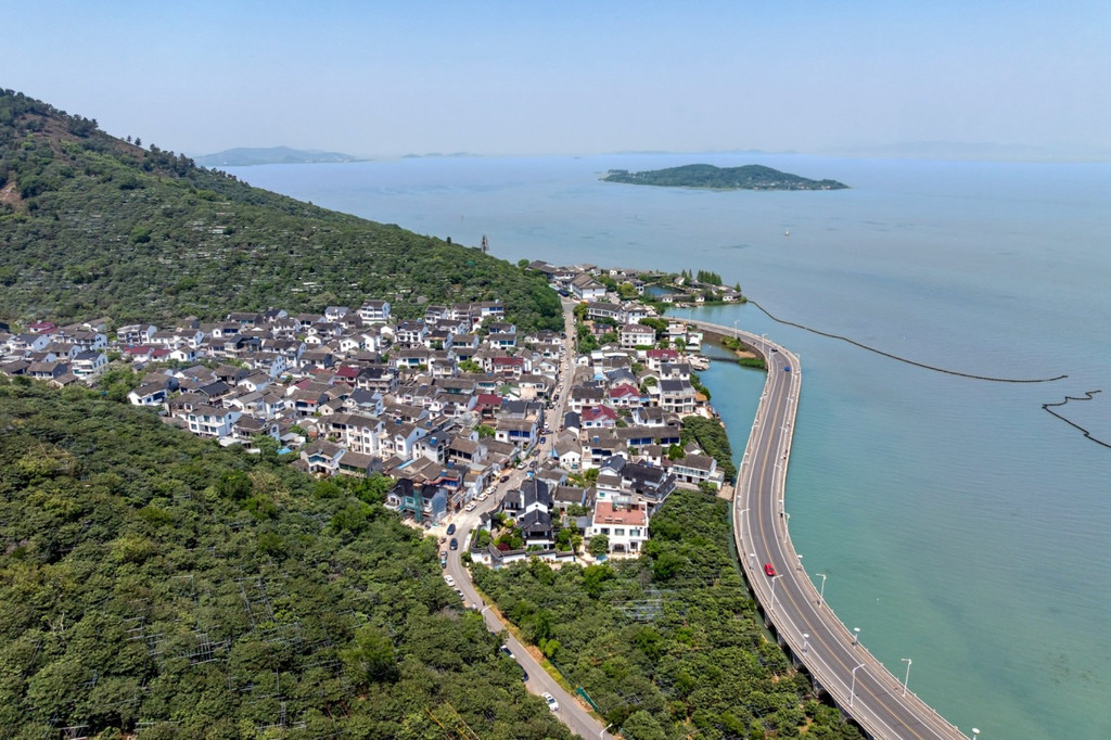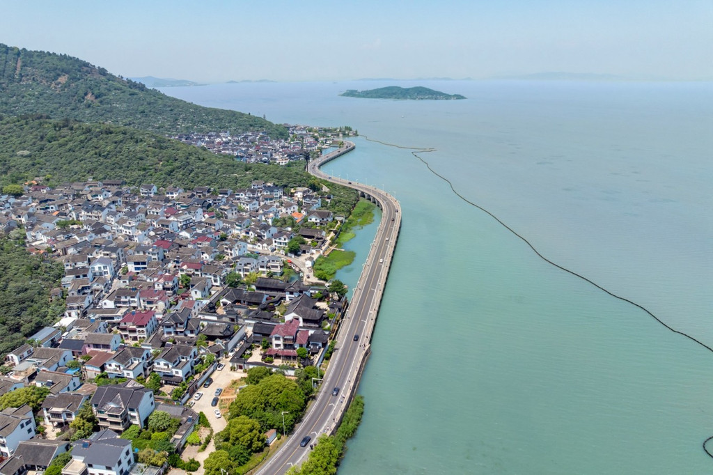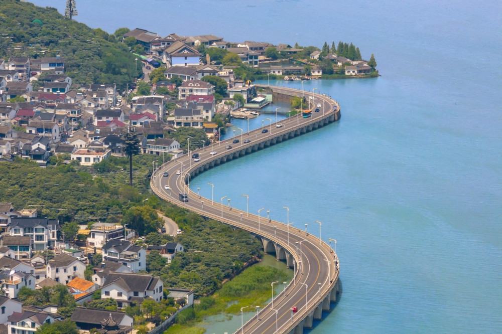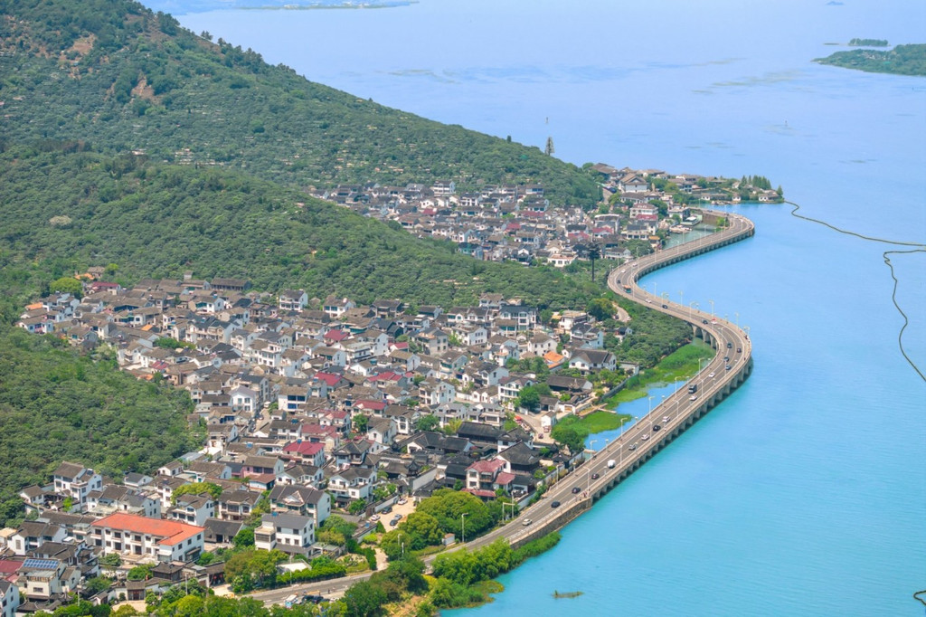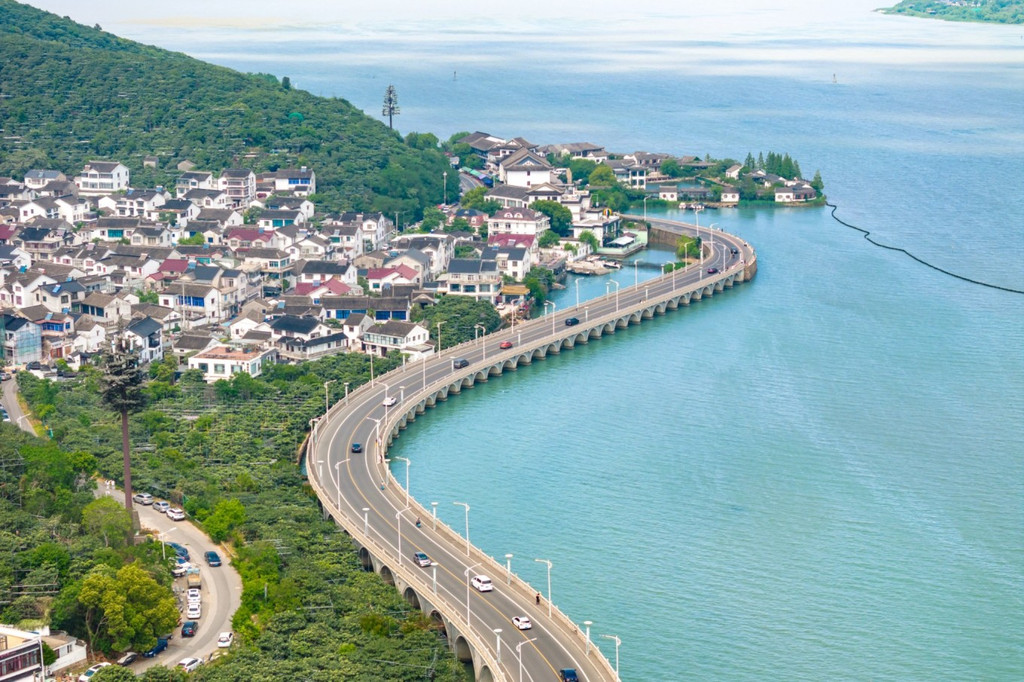 被称为“苏州小镰仓”,沿湖公路蜿蜒,碧水青山倒映,房子五颜六色掩映在山坡上,丰圻大桥和岱心湾相连!形成一道最美S弯公路,媲美大理的湖光山色,也能看到大理同款水鸟栖息。看大桥就直接导航到岱心湾公交站,这里有免费的停车场,可以在桥边航拍。