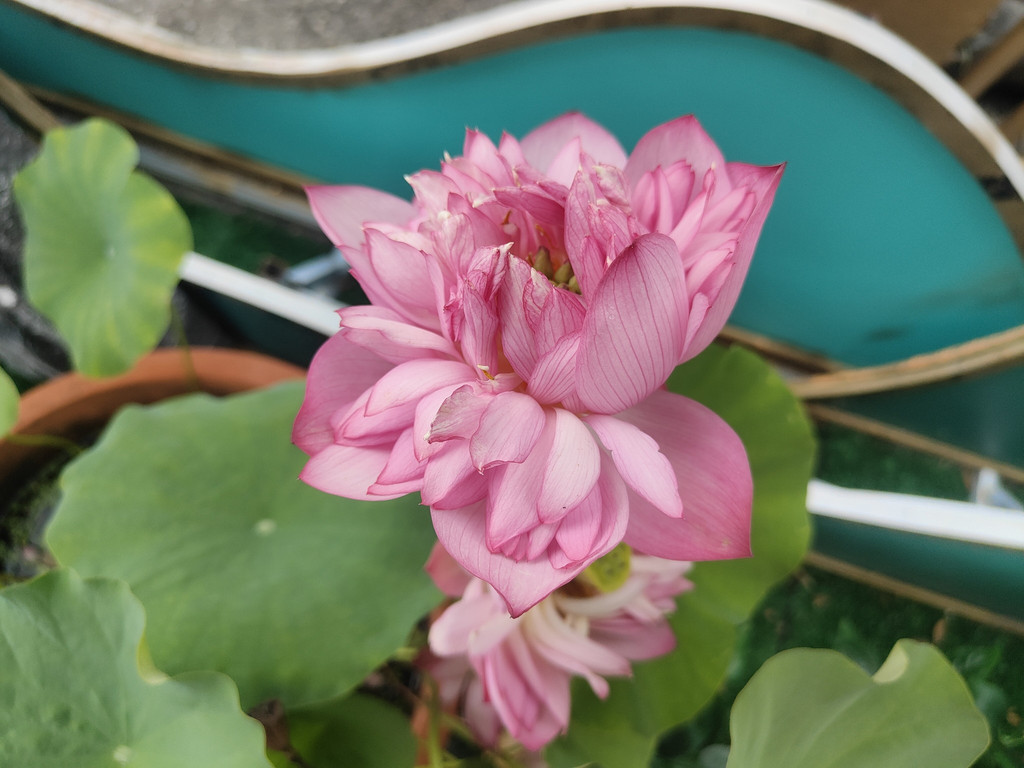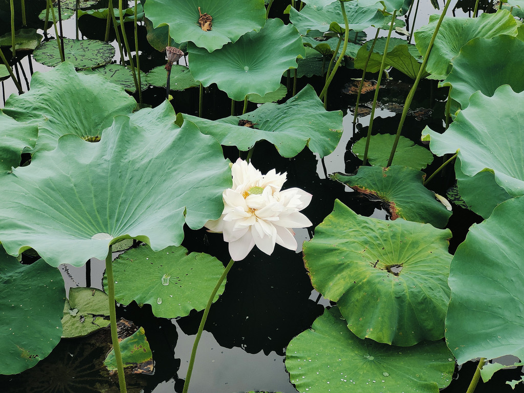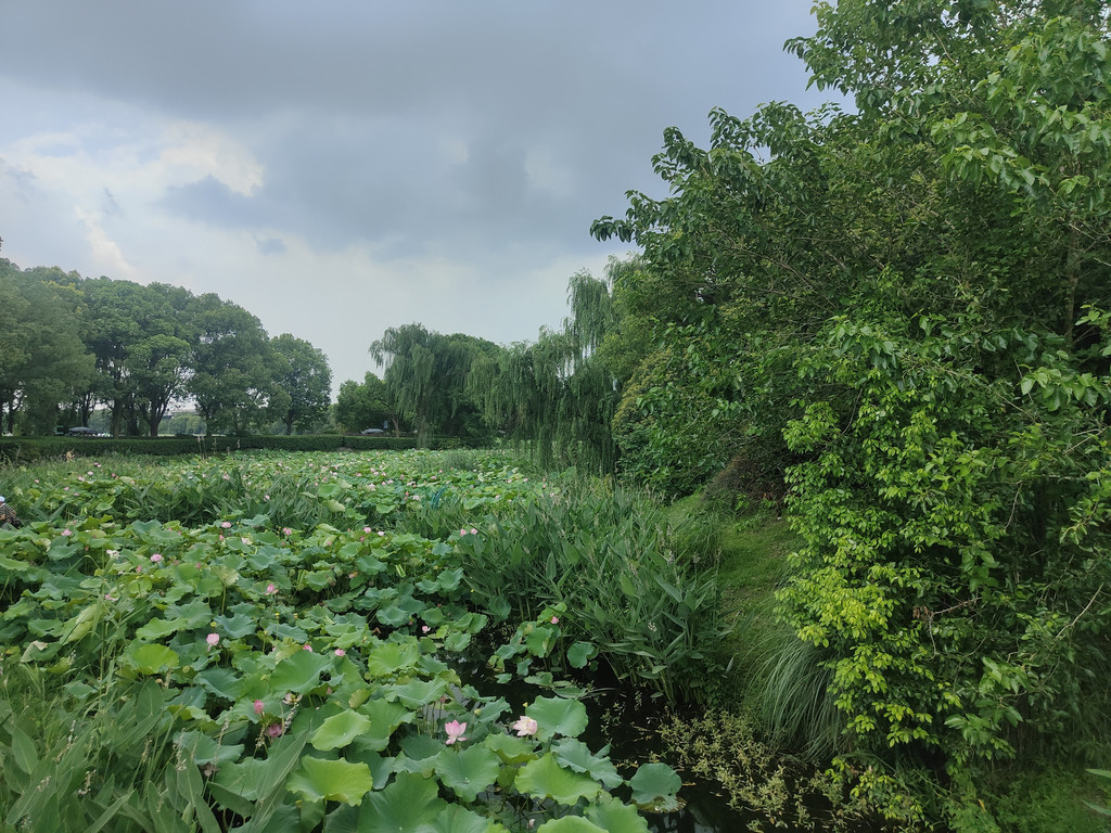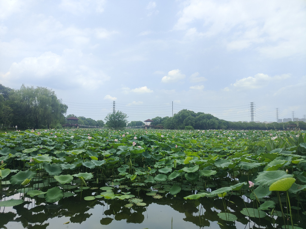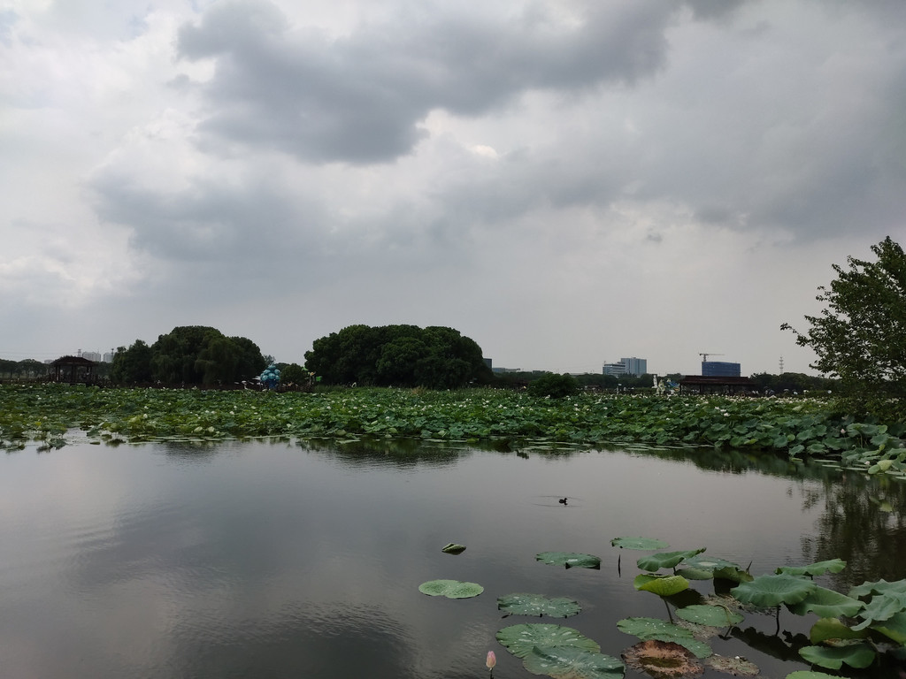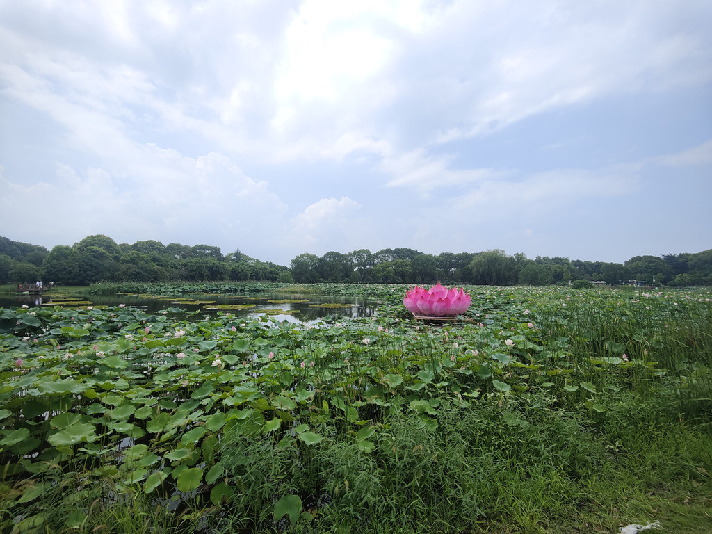 骤雨初歇,等我们走过栈道,太阳重出云层,一下子地面的温度又升腾起来。这会儿,我们反倒怀念刚才如注的大雨了。不过,雨后的荷后衬着蓝天,荷叶碧如宝石,荷花灿若云霞,放眼四顾,每一眼都像看到了一帧油画。