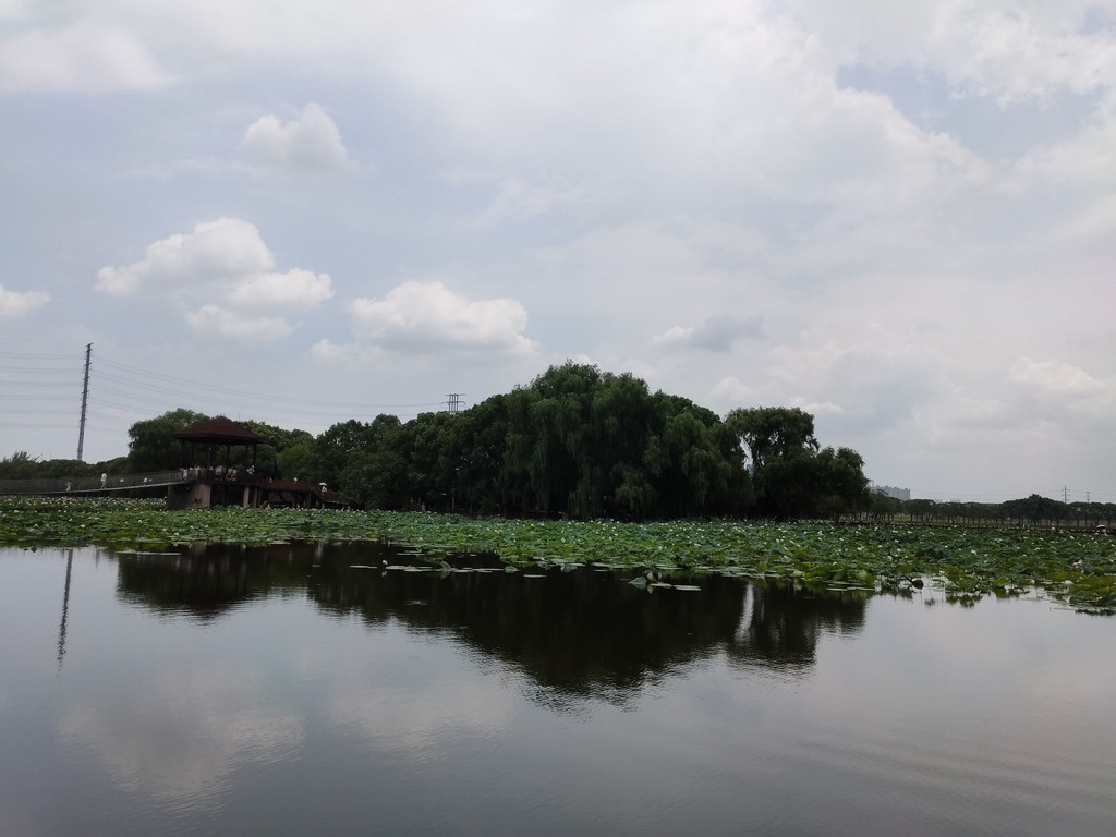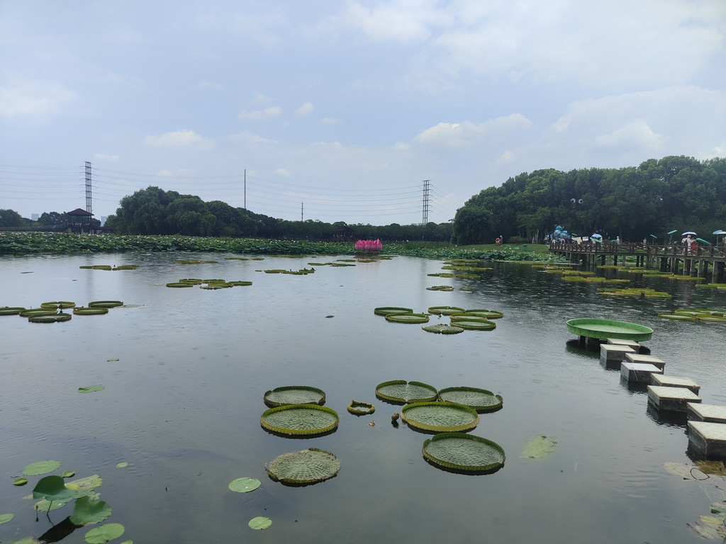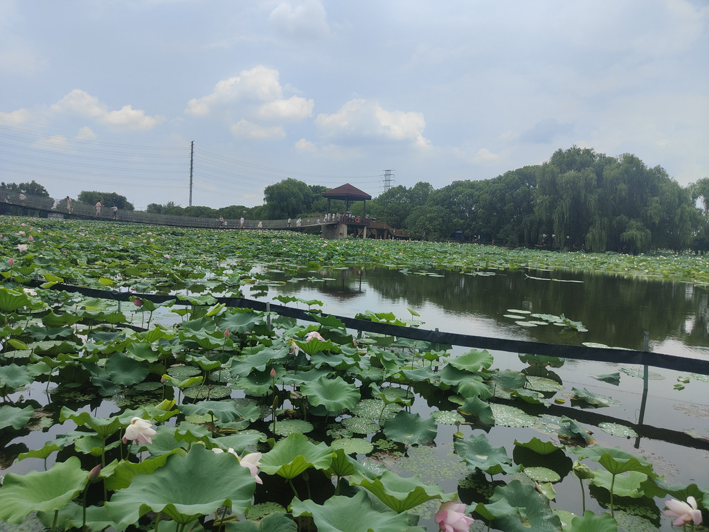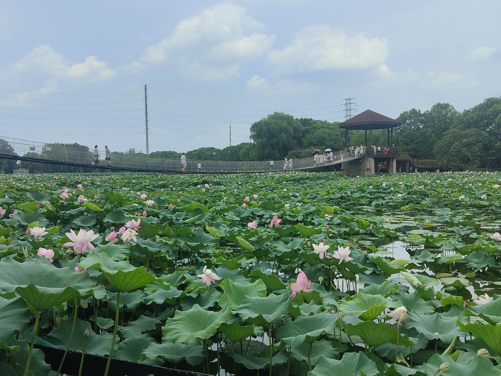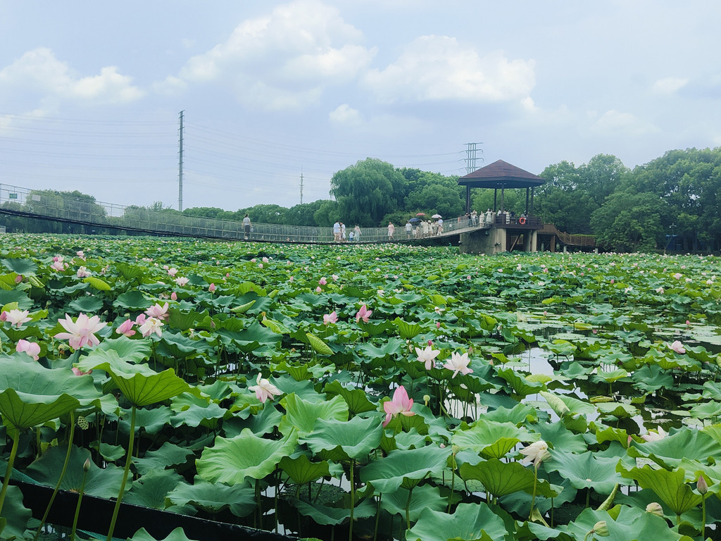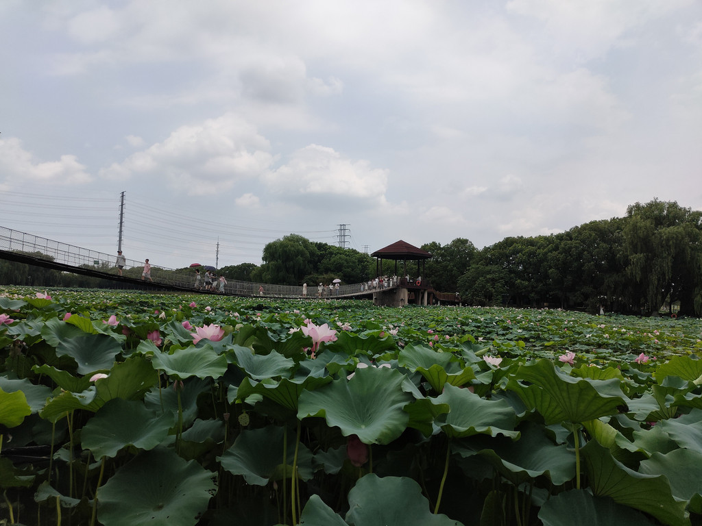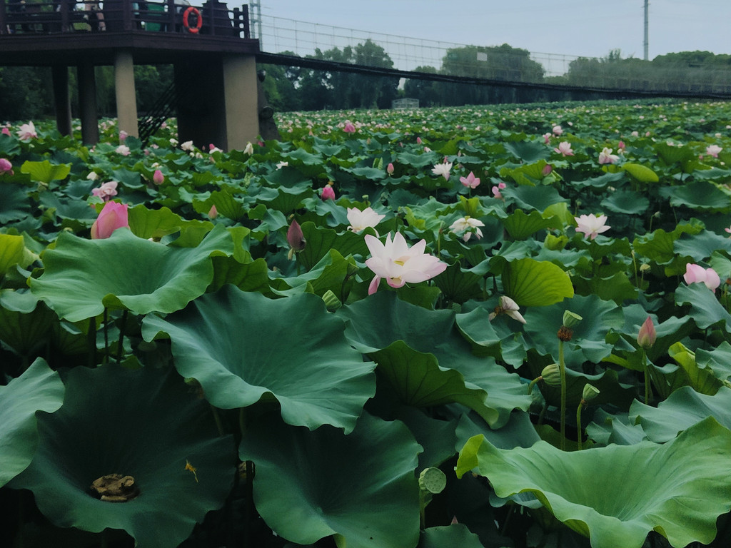 我拿出手机才拍了两张照,不知道哪个熊孩子兴致盎然地摇起了吊桥,我差点没握住手机。无奈地把手机收进包里,景色再美,我也舍不得付出手机的代价,何况我的摄影技术本身也不怎么样。这么一来,反倒一心一意观赏起这片荷塘来。