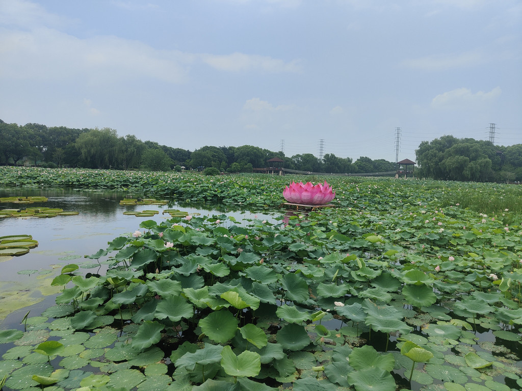 走到吊桥上的时候,忽然下起了小雨,但是这丝毫没有影响我们赏荷的兴致。这片荷塘真是大,桥两侧的荷开得满满当当,红花碧叶映天穹,即使天空不那么蔚蓝,也自成一幅绝妙好画。