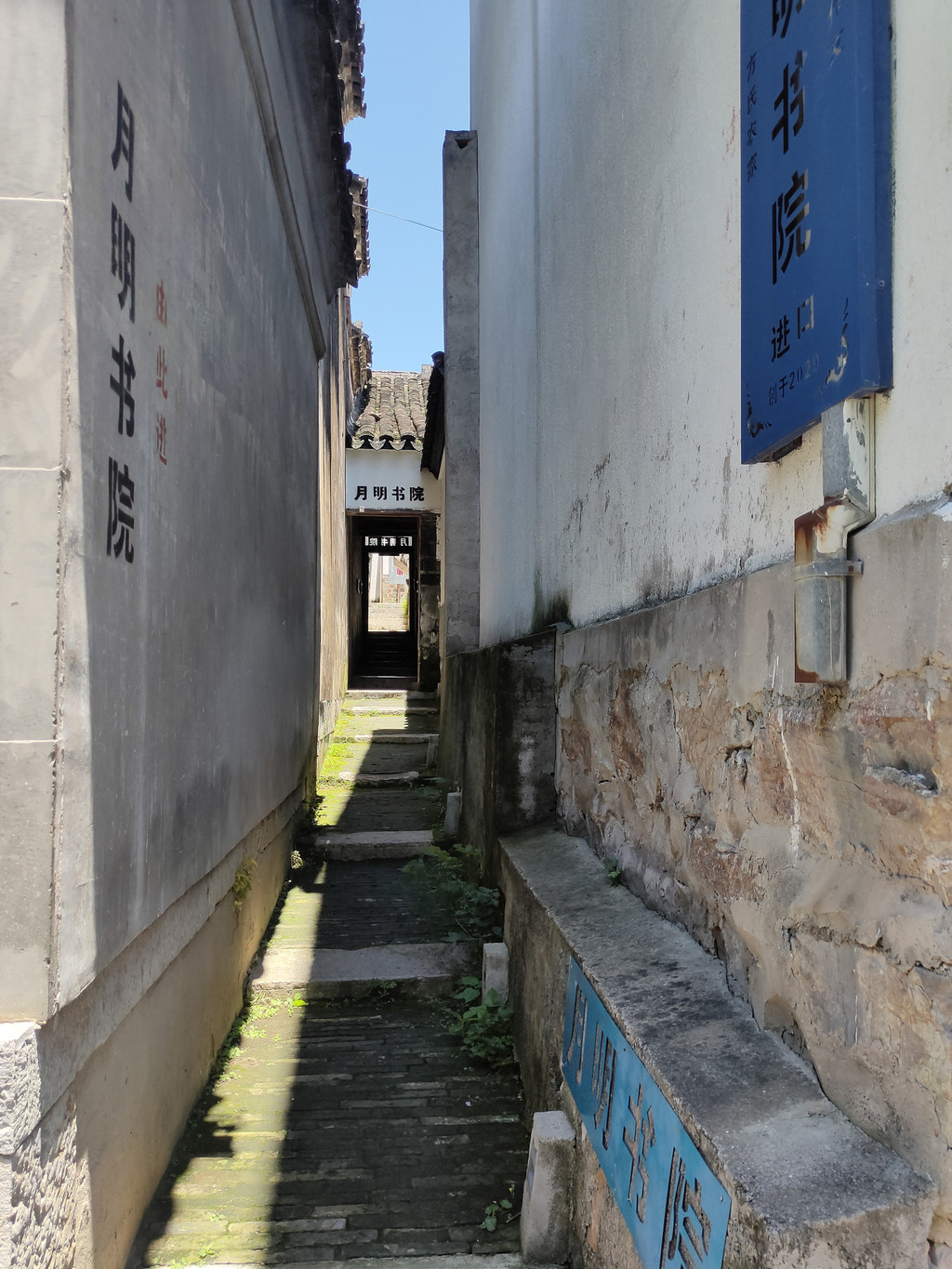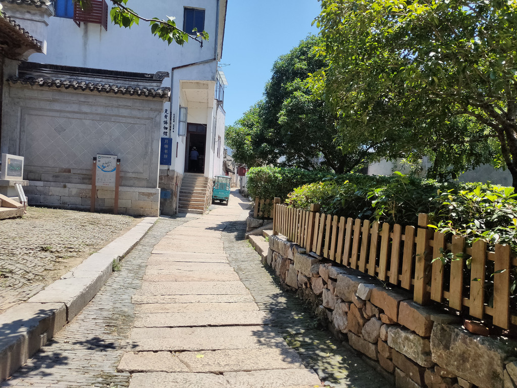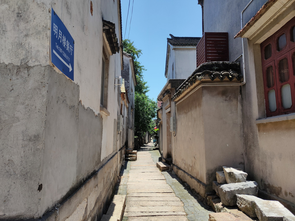 走进狭窄的月洞门,这里就是明月湾的居民区了。石板街建于清乾三十五年,总长度1140米,用4560余块花岗岩条石铺就。两侧辅以青砖,整条街道都显得古色古香。两侧的民居有的经过翻修,有的还保留着明清时期的风格。
