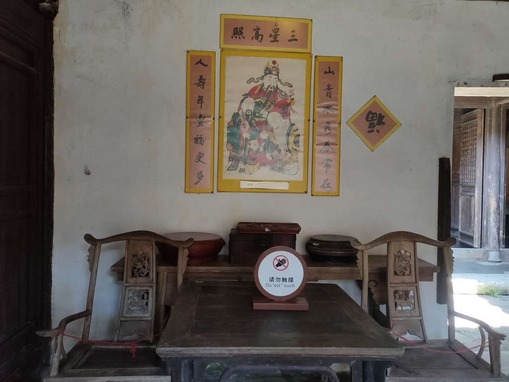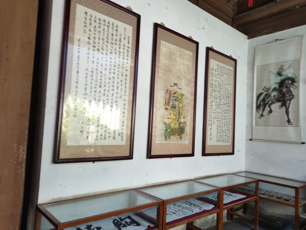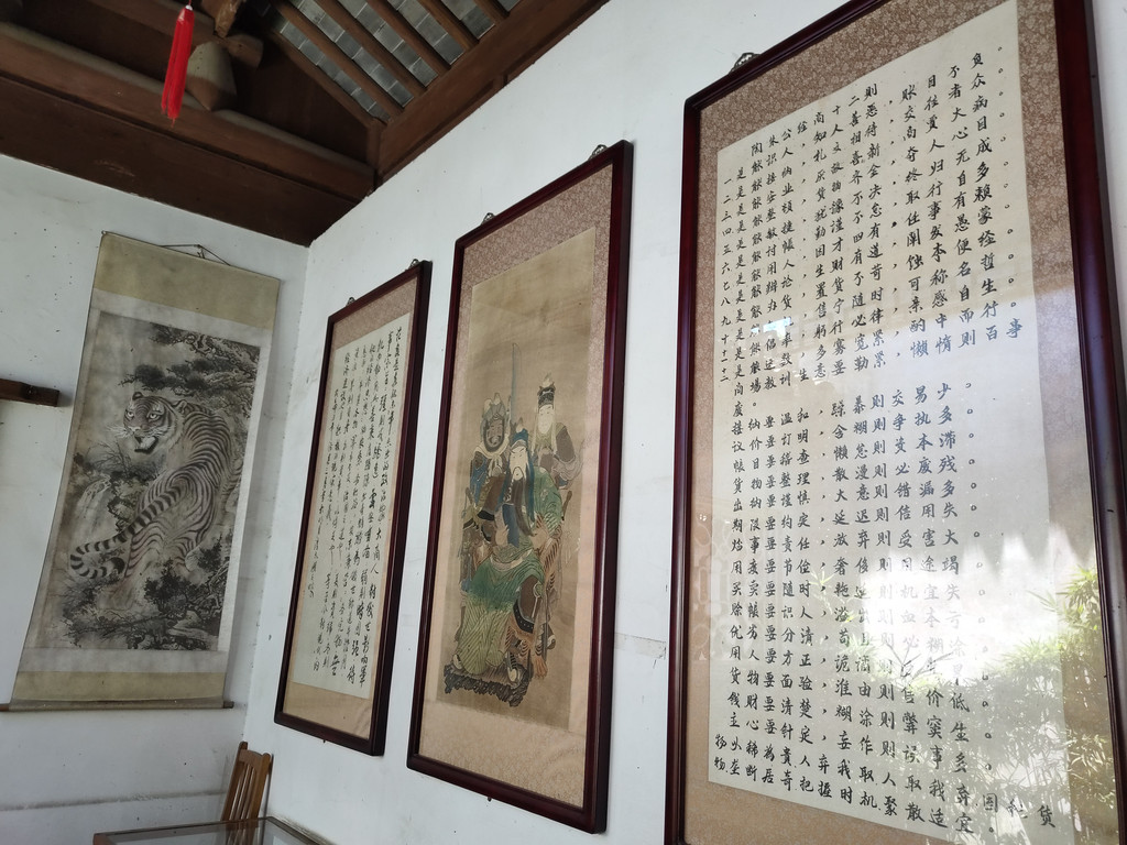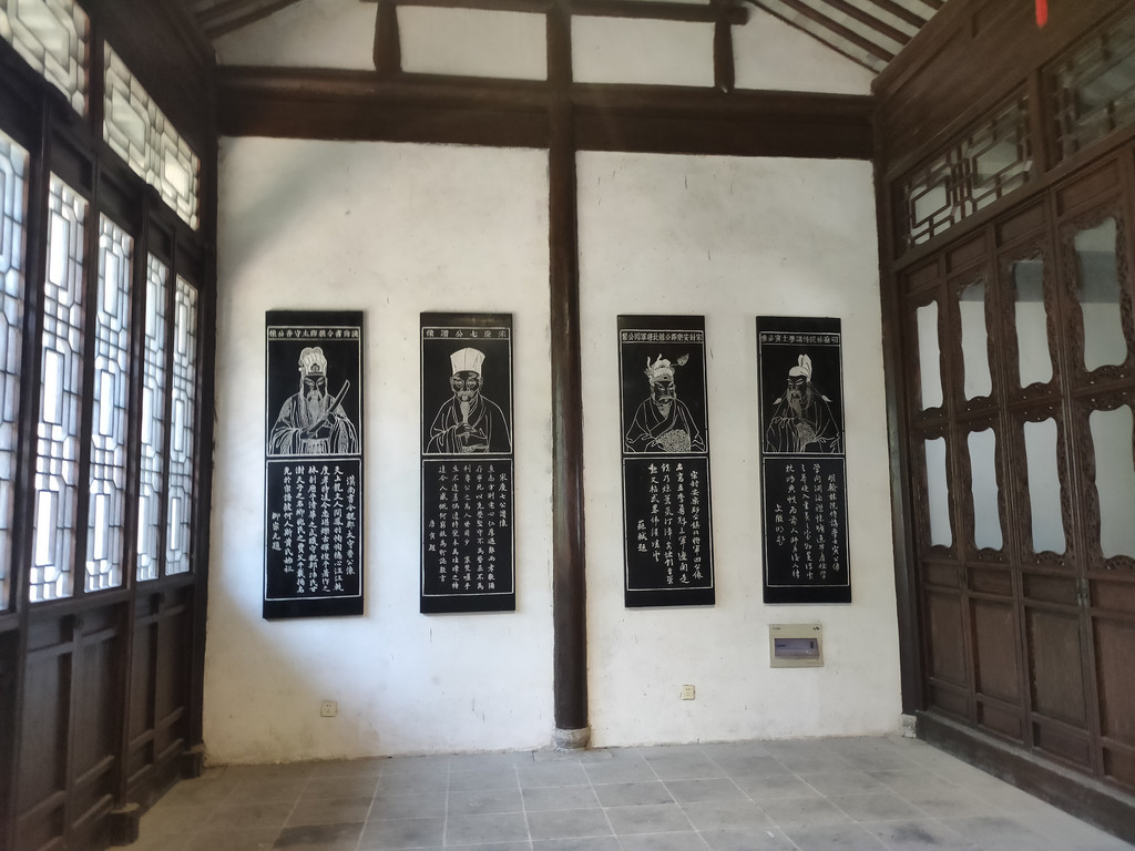 墙两侧挂着八幅版刻画,大概是黄氏祖上的人像,下方有人物介绍。这些人物我们都不认识,但是落款却无一不是名人:欧阳修、文天祥、柳宗元、苏轼、唐寅、文徵明……看来黄氏的祖上也是声明显赫啊。