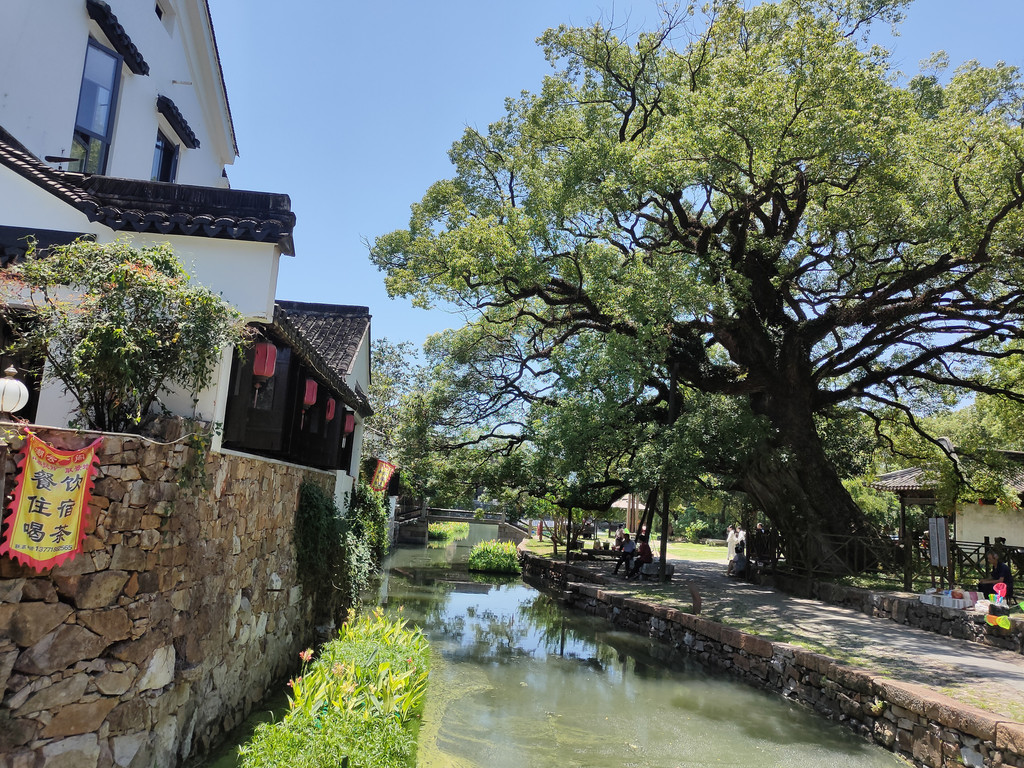 进门不远,我们就看到一株高大的古樟树,枝繁叶茂自不必说,它的姿态也很优美,树干微微倾斜,枝干便覆在道路一侧的小河上,如同一位美女正临水照影。这株樟树已经有千年的历史,我原来只知道西山的古樟园,没想到这里还藏着一株“高龄”古树。