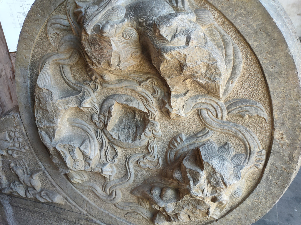 后堂有一条长桌,玻璃桌面,下面是柜子,放着一些碑刻,不知道是关于黄氏家族的,还是历年收集而得。