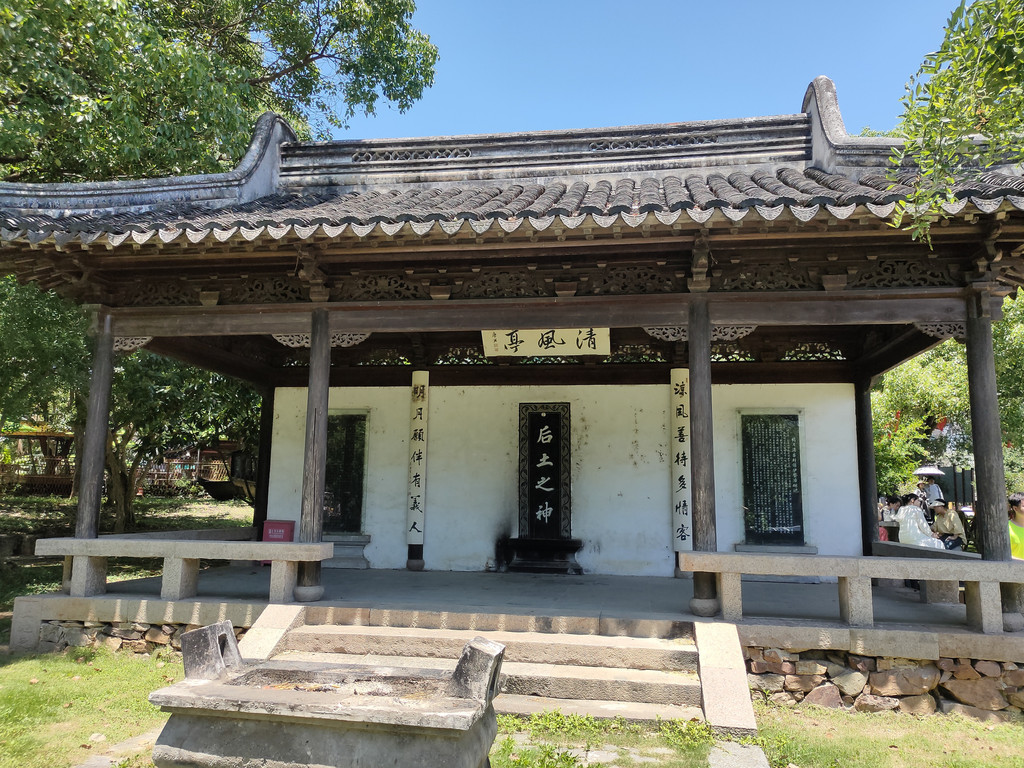 大树的一侧有座清风亭,说是亭子,其实有点像轩,只是墙少了点,只有一面,其余三面是敞开的。正中供奉一块碑“后土之神”,想来这就是土地庙了。柱子上有一副对联:“凉风善待多情客,明月愿伴有义人”,情和义都有了。