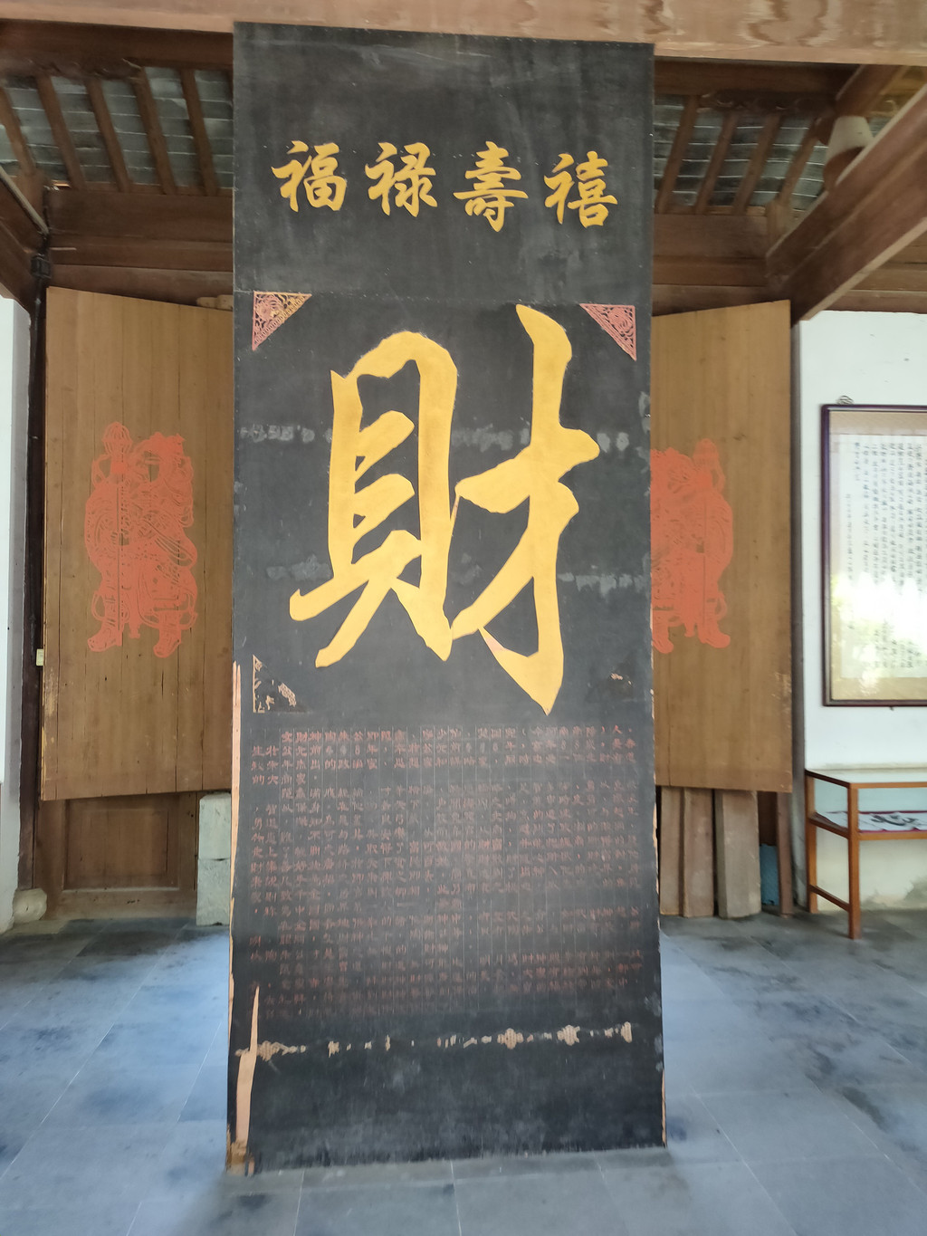 刚才我们看到的福字碑是红色的字,这里有一块“财”字碑是金色的,上面还有“福禄喜寿”四个小字,也是金光闪闪。砖雕门楼很精致,每一层上下都有万字纹。