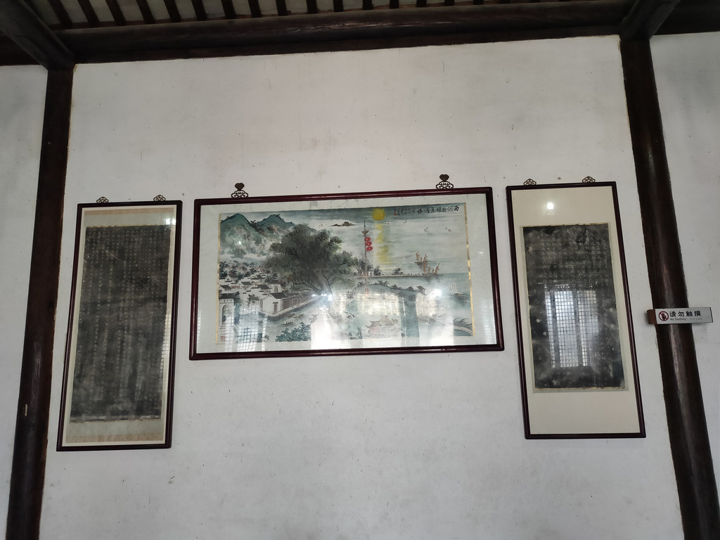 墙上挂着图文资料《明月湾史迹介绍》,是从诗文、家谱、碑刻及口碑等资料中筛选整理而成的。这里留传着许多关于吴王的传说和遗迹,原本这里就是吴越相争时吴国的前沿阵地。而西施的故事,更是为这里又凭添了几分浪漫。