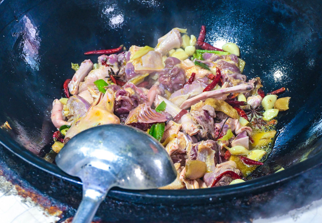 宿州 宿州首先将鸡肉切块,用料酒和姜片腌制,在砖砌的锅墙上,加上木材、旺火烧煮,文火慢炖、加上天然的野蘑菇,大葱、姜、蒜、川椒、樱头椒等配料烧制,待鸡肉熟烂,汤汁浓郁即可。