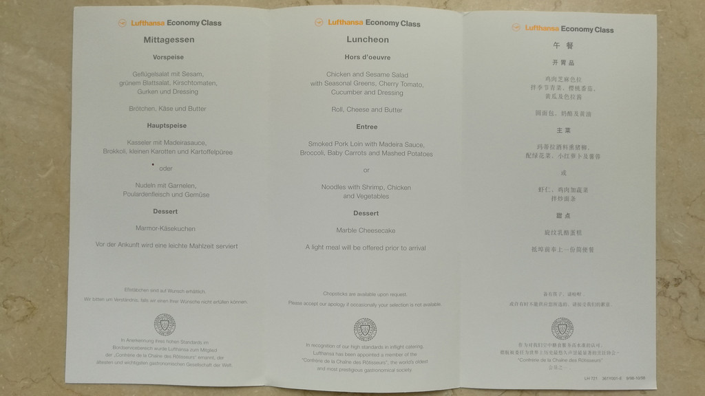 行程第一站,乘坐汉莎航空LH721从北京直飞法兰克福。当时只有北京、上海、广州才有直飞航班,现在方便多了,深圳、重庆、南京、西安、成都、青岛、沈阳等城市都可直飞法兰克福,还可直飞柏林、慕尼黑、汉堡等地。