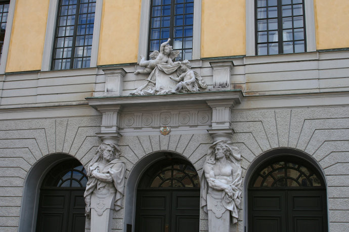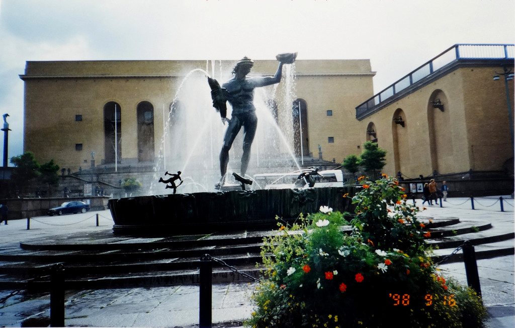 哥德堡文化广场,雕像是希腊海神波塞冬(Poseidon)。海神躯体壮实,右手紧握一条大鱼,左手托举一个贝壳。鱼口和贝壳流出的涓涓清泉提醒人们,哥德堡是一座海洋城市。注意到没有,广场周边的很多房间没有窗户。1930年代的瑞典很保守,沿街居民不愿天天看到一个光着身子l的雕像,就把窗帘放下遮羞,久而久之,有些房屋朝向大街的一侧就不安装窗户了。