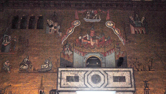 蓝厅上方是金色大厅,墙面是一幅幅马赛克壁画,由1800万块1厘米见方的金箔和彩色玻璃镶嵌而成,在灯光下显得金碧辉煌、富丽堂皇。记不清自己是否上去参观过,按道理,来了应该上去看看,但手头找不到照片或资料,放几张网上的图片吧。