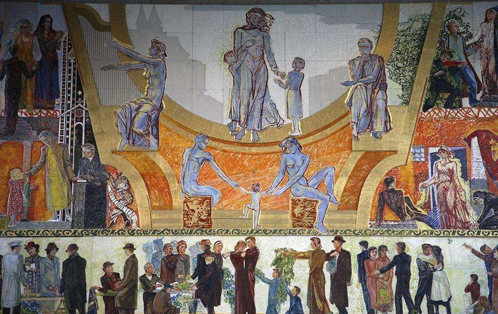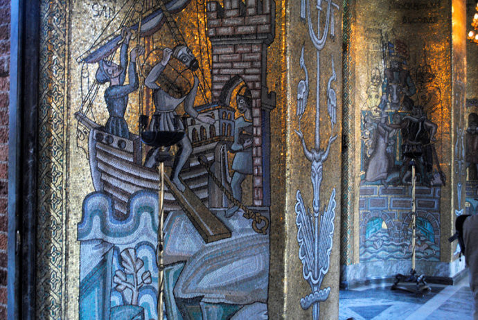 上文提到,奥斯陆市政厅是每年诺贝尔*和*平*奖的颁奖地。这里就是颁奖大厅,地面采用挪威国产大理石铺就,有白、黑、黄多种颜色。墙面壁画描述的是当年建国时的奋斗精神,人民工作和生活情形,多彩多姿,生动传神。