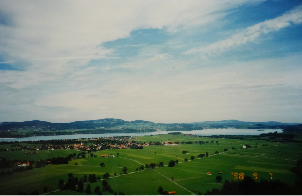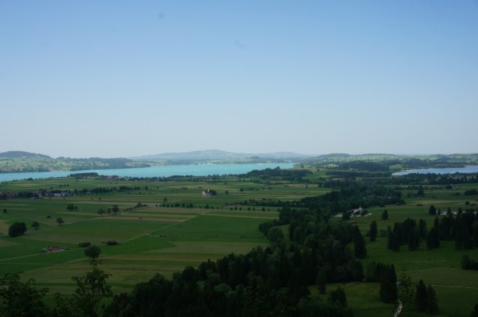 走出城堡,在高处远眺,左前方是阿尔卑斯湖,右前方是天鹅湖。后面是德奥边界连绵的阿尔卑斯山和巴伐利亚乡间美景。