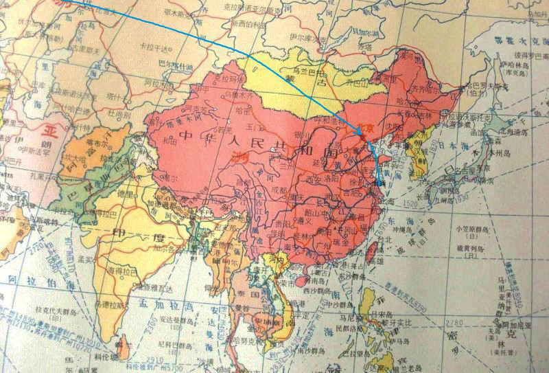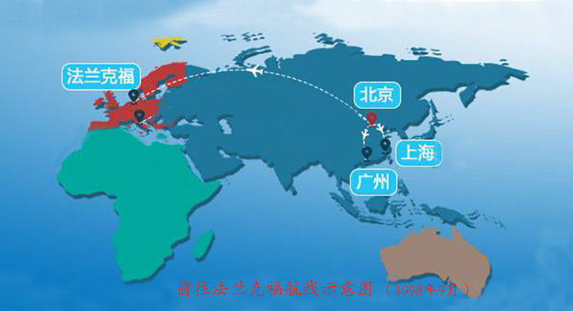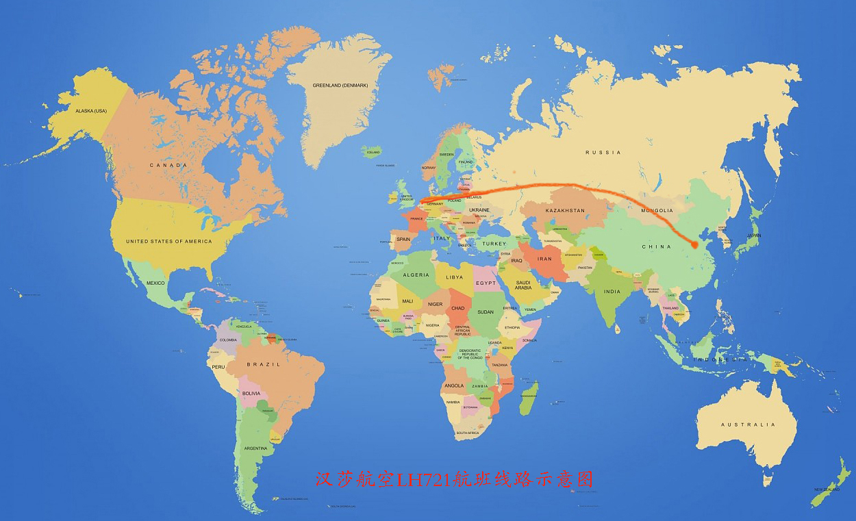这趟航班的航线是从北京向北,经过蒙古、哈萨克斯坦、俄罗斯,然后向西,经白俄罗斯、波兰,到达德国法兰克福。