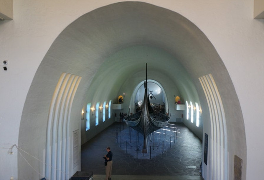 接下来参观海盗船博物馆。挪威是一个有着悠久航海历史的国家,首都奥斯陆拥有4个著名的航海博物馆,这是其中之一。博物馆的圆拱形展厅像一座巨型地道,陈列着8—10世纪出没于北欧海域的海盗船。