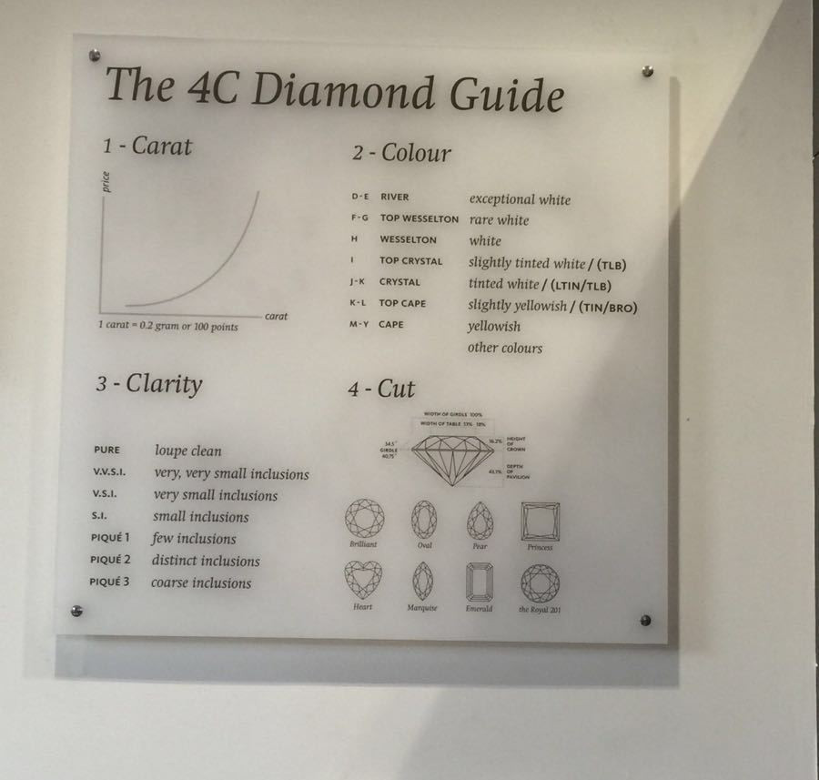 阿姆斯特丹的钻石加工技术在业界很出名,是完美切割与高质量的代名词。在这里长了见识,知晓钻石的成品制作分为三步:切割、整形、打磨(当时最多能打磨57个平面,上面33下面24,称为灿烂型)。一颗石头原料经过处理,大约有50%会被扔掉。评价钻石的标准是4C:Carat(克拉,重量)、Color(颜色)、Clarity(纯度)、Cut(切割工艺)。1克拉(Ca)=0.2克(g)=100分(p)。海蓝色、蓝色最好,纯度(perfect)分VVS(very very small Inclusions)瑕疵、VS瑕疵、P1(小花)、P2(中花)、P3(大花)等。VS净度等级以上十分稀有,瑕疵也是钻石的一部分,是大自然赋予每颗钻石的独特标记。
