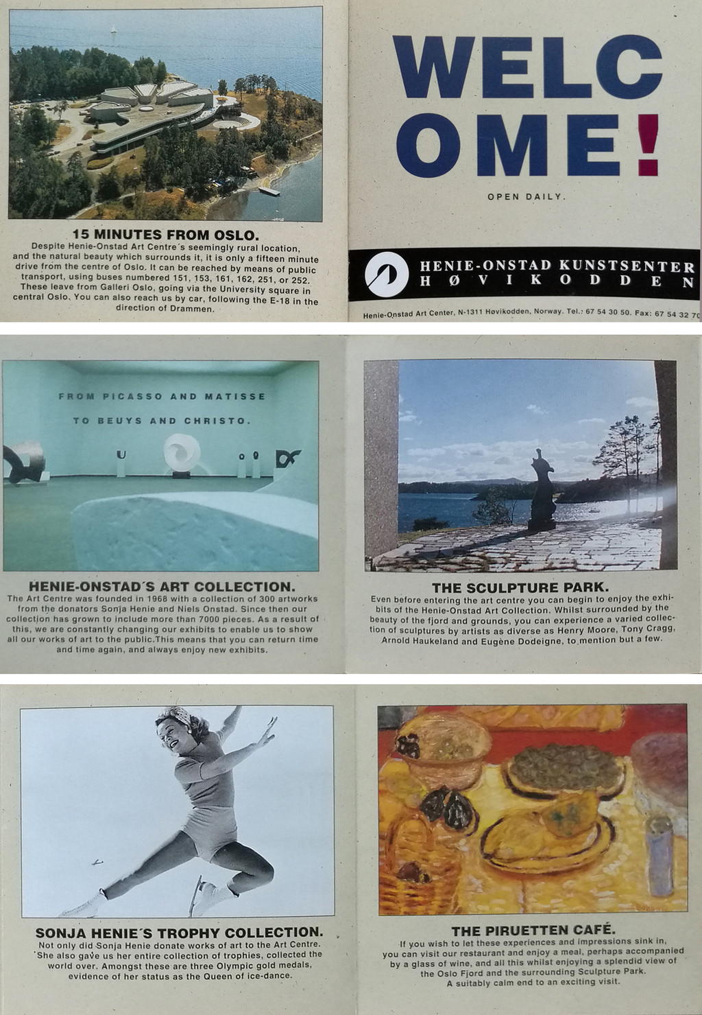 Sonja Onstad艺术中心,位于奥斯陆市郊,由索尼娅·海妮Sonja Henie及其丈夫Niels Onstad共同创办。索尼娅·海妮(1912—1969),挪威花样滑冰运动员,曾获得三次花样滑冰女子奥运会冠军(1928年、1932年、1936年),十次世界冠军(1927-1936年)、六次欧洲冠军(1931-1936年),她创造的纪录至今未被打破。竞技体育生涯结束后,她前往美国成为一名电影演员,是当时好莱坞的三大台柱之一。1939年7月17日还登上时代周刊封面。