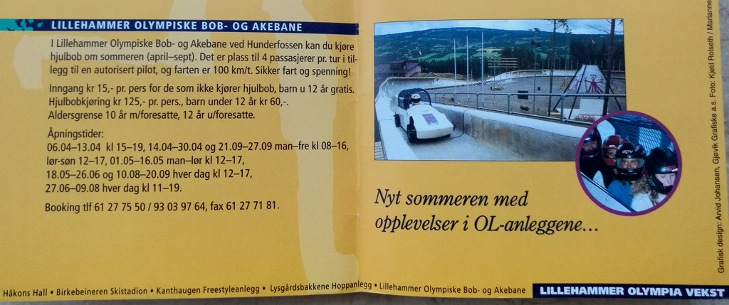 在奥运场馆体验了bob滑车运动,那个滋味,现在想起来牙齿还打颤。4个人坐在下图这种密封车里,戴着头盔,有专人在前面驾驶,沿着1000多米的轨道,从高处往下滑行,时速100公里,前后也就一分零七秒,我却感到无比漫长,非常刺激。开始时还算平稳,没什么感觉,随着势能逐渐转变成动能,速度越来越快,离心力越来越大,身体渐渐失去控制,自己不能平衡,头盔叮叮咚咚撞击脑袋,眼前一片模糊,巴不得早点结束。据说这本是一种冬季雪橇运动,需要很强的身体素质,孕妇、心脏病患者以及脊椎、颈部有毛病的人不宜参加。票价每人125 挪威克朗NOK(约合125元人民币)。