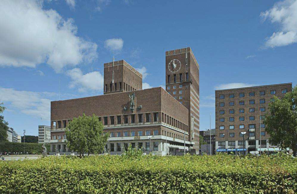 奥斯陆市政厅由一组凹状红色建筑组成(与斯德哥尔摩市政厅外观颜色一样),两幢主楼被称为“双塔红砖”。1900年开始兴建,经过不断的装饰和润色,于1950年奥斯陆建城900年时正式完工。市政厅全面展示了挪威的历史、文化以及居民的工作和生活。