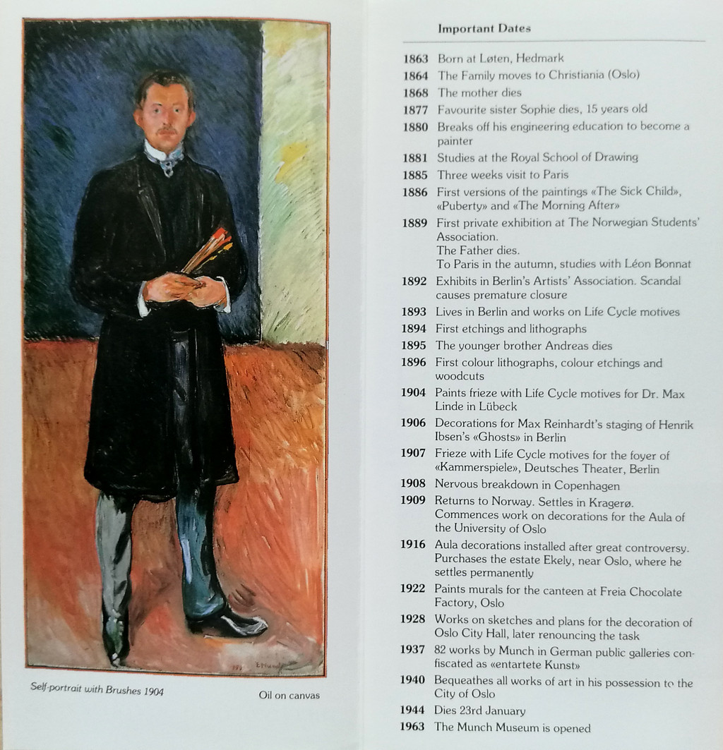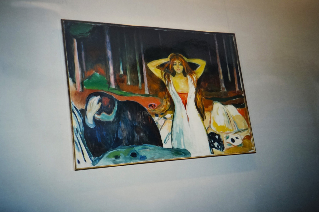 前往蒙克美术馆Munch museet参观。爱德华·蒙克(Edvard Munch,1863—1944),挪威印象派画家,现代表现主义绘画的先驱。他的绘画带有强烈的主观性和悲伤压抑的情调。主要作品有《呐喊》《生命之舞》《卡尔约翰街的夜晚》。据说其家族有精神病史,他把对人生、女人、生与死的独特悟性,通过画作表现出来。