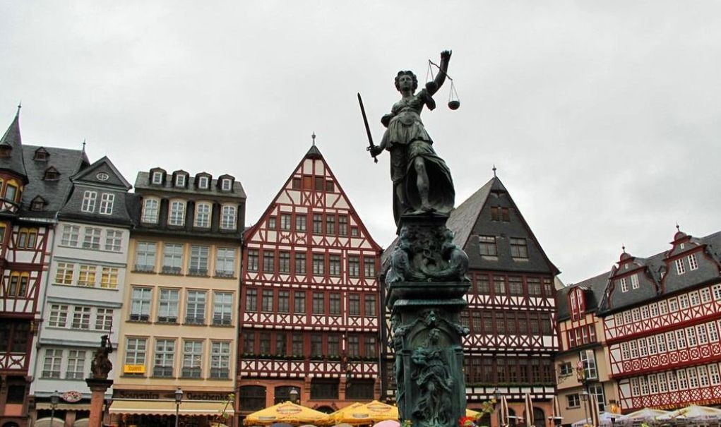 法兰克福罗马贝格广场。中间有正义女神喷泉,女神手持象征公正的天平。周边的连体哥特式建筑,山墙为人字型。