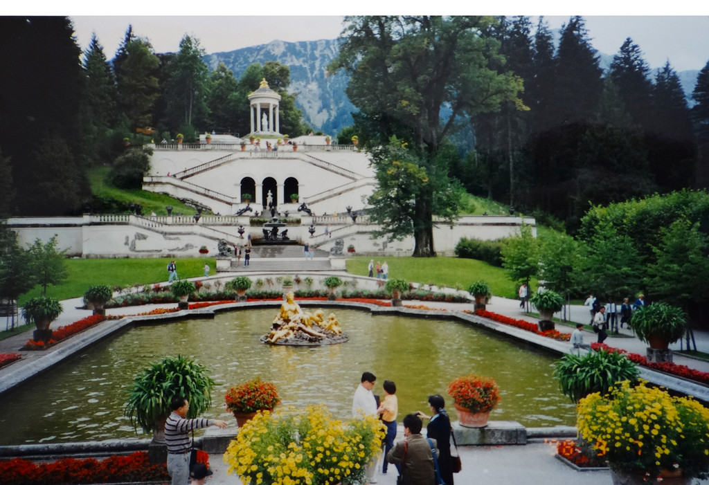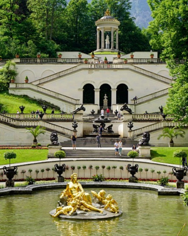 穿过绿廊来到林德霍夫宫。这是路德维希二世狩猎休息的地方,虽然比新天鹅堡建得晚,但它是唯一一幢国王在世时完工的建筑。当时巴伐利亚州一年的收入700多万,他竟用600多万建造这座宫殿,也太任性了。宫殿仿照巴黎凡尔赛宫,具有浓郁的洛可可风格。内部金碧辉煌,可惜也不允许拍照。记得餐室很奇特,有一张可升降的“自动上菜魔桌”,据说这位怕见人的国王喜欢独自一人进餐。