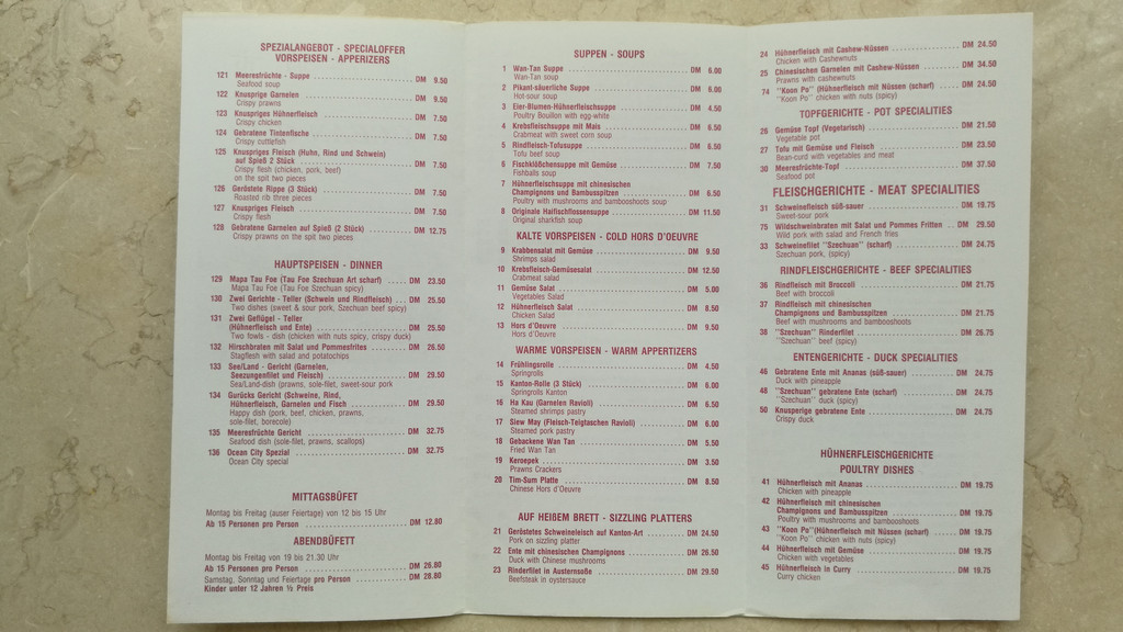 看看菜单,一份海鲜汤,德国马克9.5DM;一份炸鸡,DM7.5;一份牛肉,7.5;馄饨干面,7.5;酸辣汤,6;套餐(含猪肉、牛肉、鸡肉、对虾、比目鱼、蔬菜),29.5。1998年,德国马克1元相当于人民币5元,国内中等城市刚毕业的大学生每月工资1600元左右,由此可以看出两国居民的生活水平。