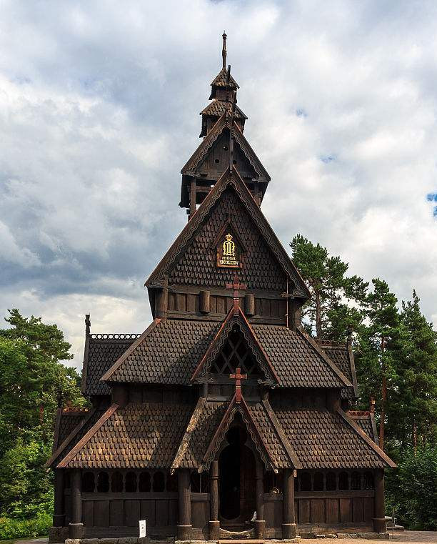 最引人注目的是这座木造教堂(Stavkirke),全部用木板建成,反映了挪威传统建筑风格。