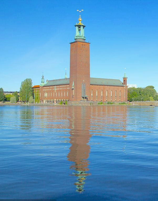 斯德哥尔摩市政厅位于梅拉伦湖畔,是一座宏伟壮观的红色砖瓦塔楼,外墙由800万块红砖砌成。前后历时12年,于1923年落成启用。每年12月10日的诺贝尔逝世纪念日,在这里颁发诺贝尔奖(不包括和平奖,那是在挪威奥斯陆颁发)。