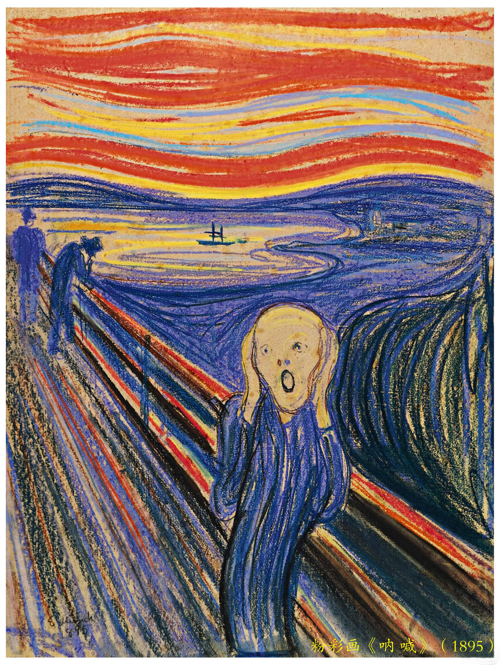 《呐喊》(The Scream):描绘人类内心焦虑和绝望的经典之作。画面中央是一位性别不明的扭曲人物,双手捂住耳朵,张大嘴巴,表现出极度的痛苦和恐惧。背景中两个行人在桥上漫步,远处是奥斯陆峡湾的景色。作者采用强烈的色彩对比和流动的线条,使整个画面充满动感和紧张感。红色天空和扭曲的形象,象征着内心的恐惧和外界的压力 。