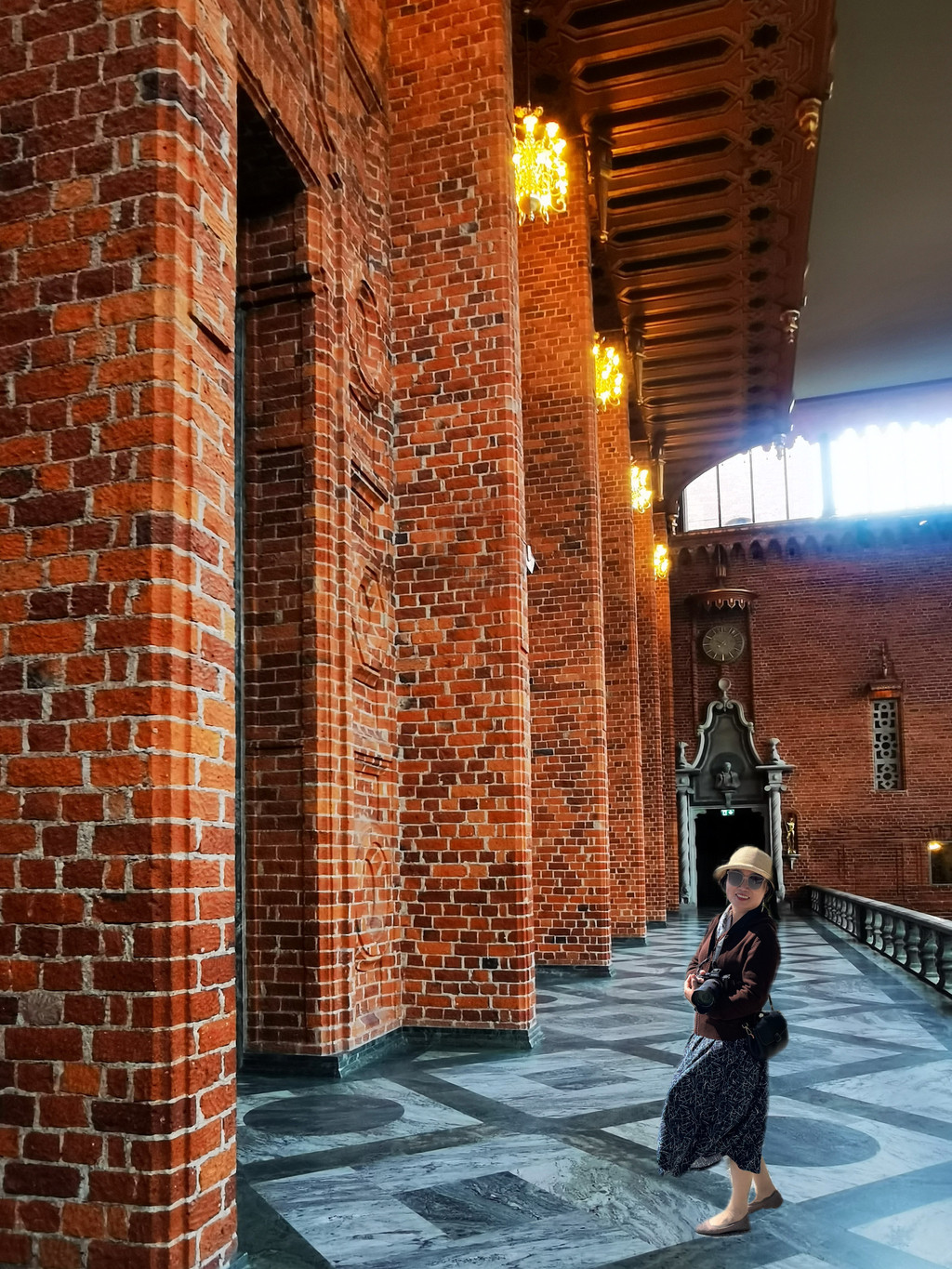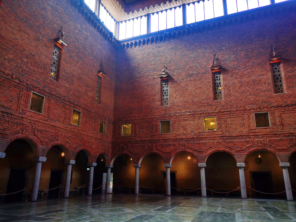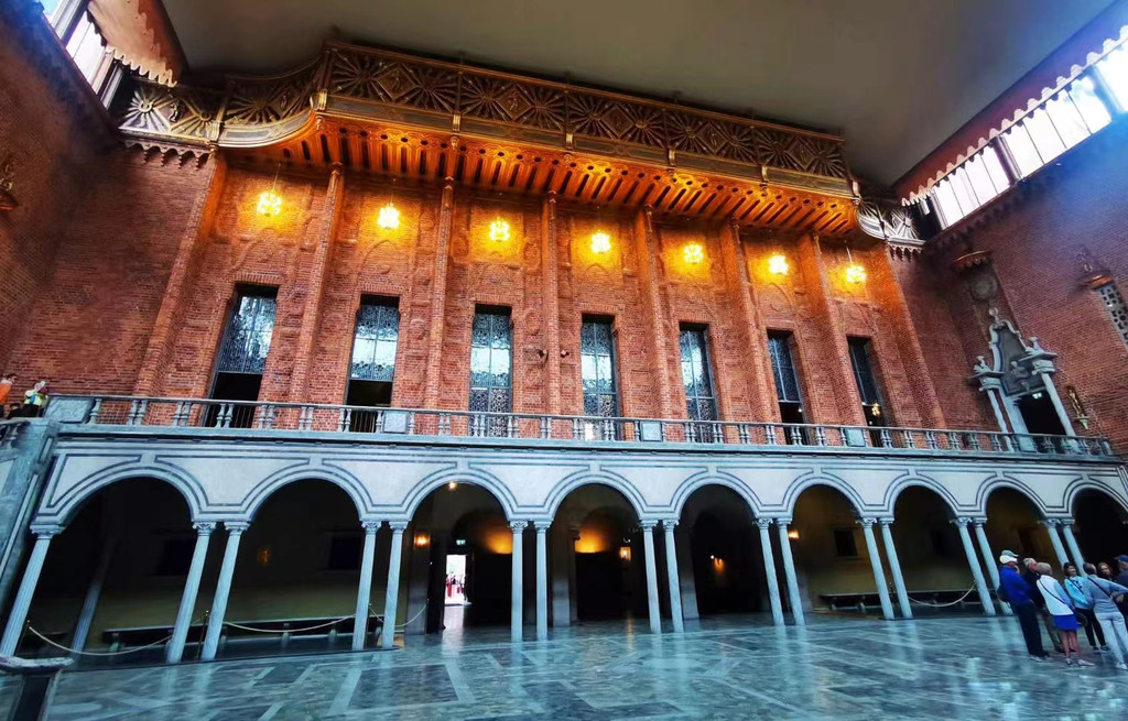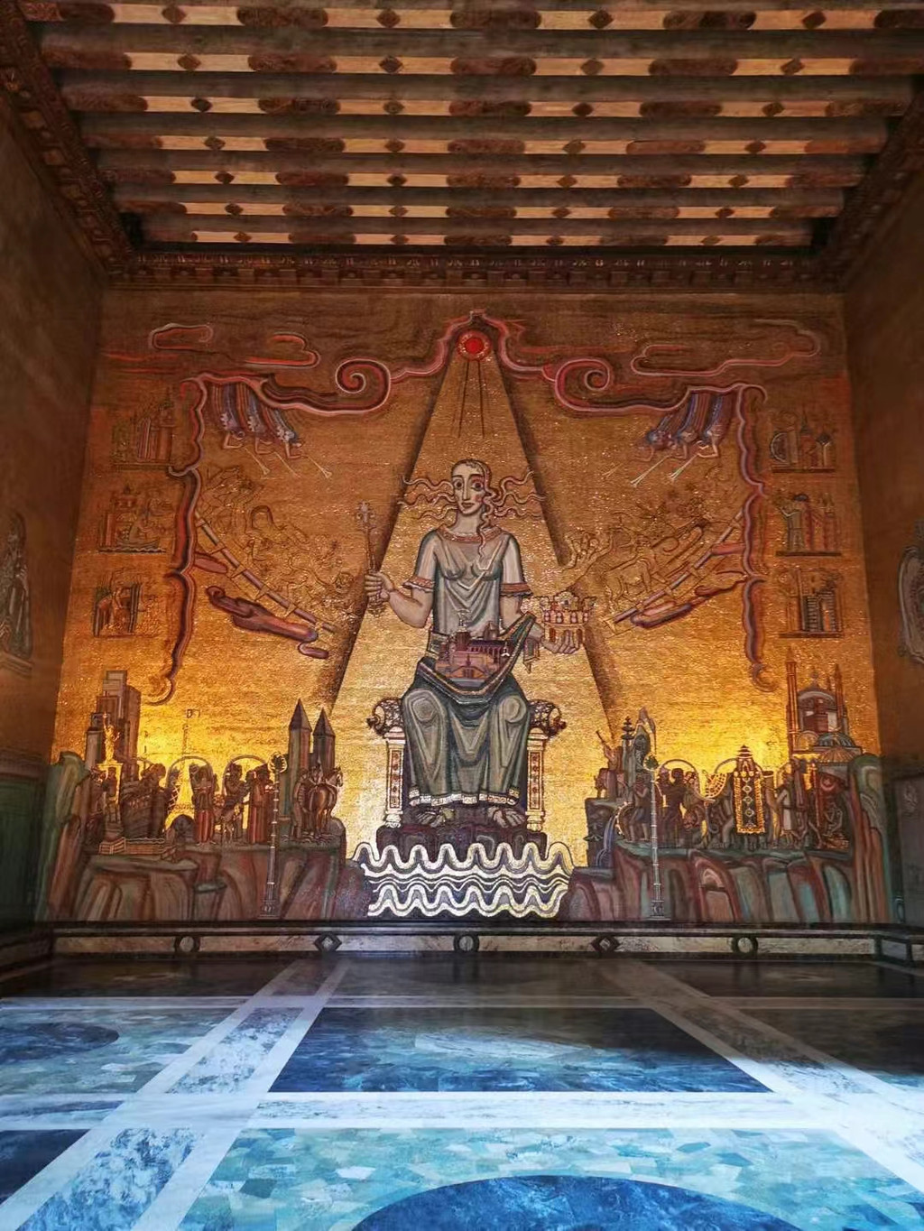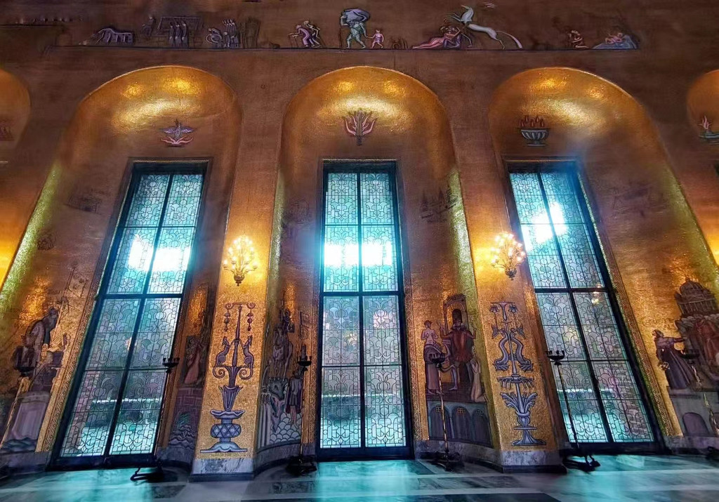 市政厅内还有一个由1800多万块黄金及小块玻璃片拼成的马赛克画所装饰的金色大厅,流光溢彩,金碧辉煌。正中墙上大幅壁画上方,是端坐着一位神采飞扬的梅拉伦湖女神。女神脚下尚有两组人物,分别从左右两边走近她。这幅壁画象征着梅伦湖与波罗的海结合而诞生的斯德哥尔摩,是人类向往的美好之地。它不仅是一幅现实主义与浪漫主义相结合的艺术杰作,也是市政厅的“镇厅之宝”。整个大厅在灯光下,金光闪耀,显得无比辉煌壮丽,诺贝尔奖颁奖典礼后舞会就在这里举办。