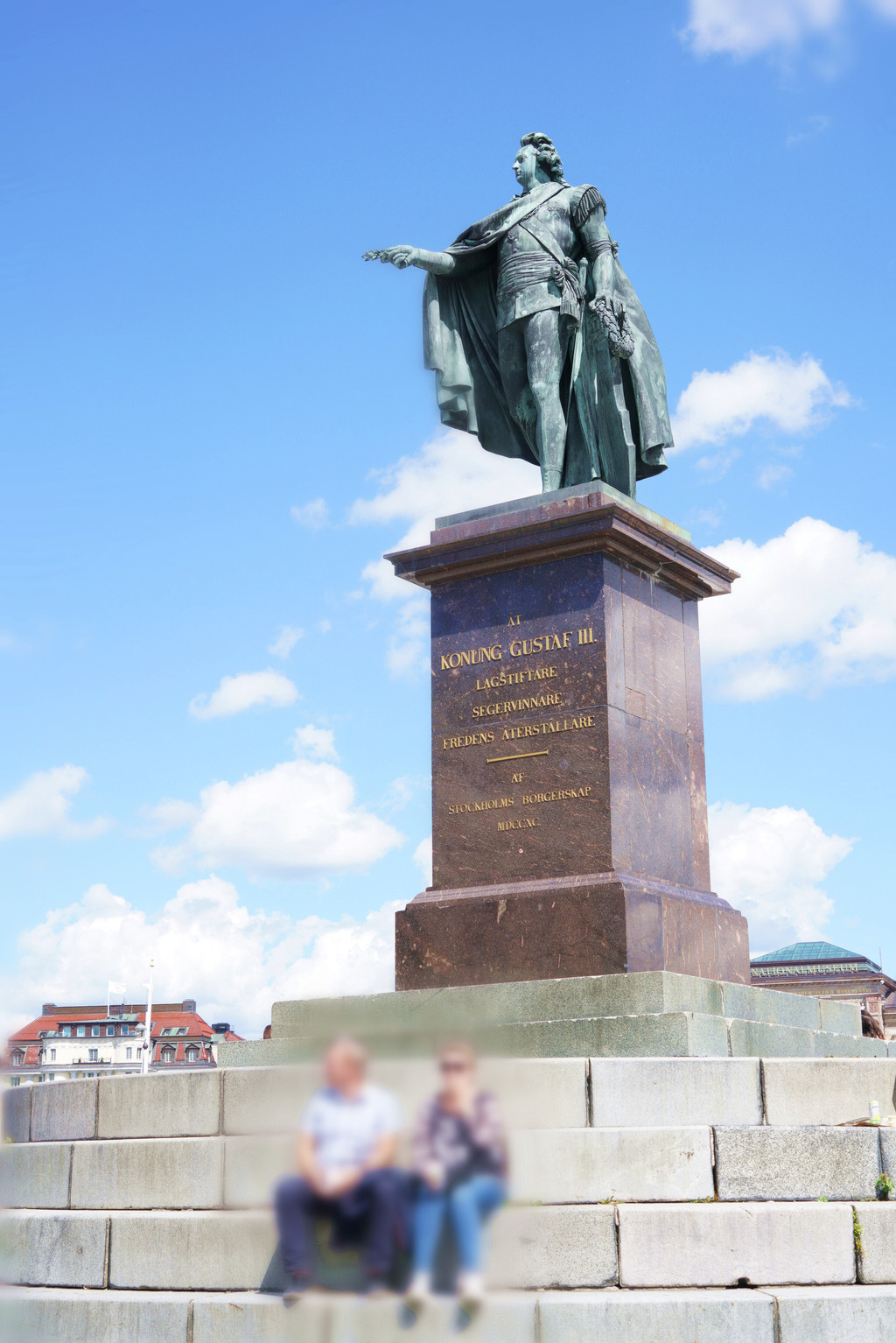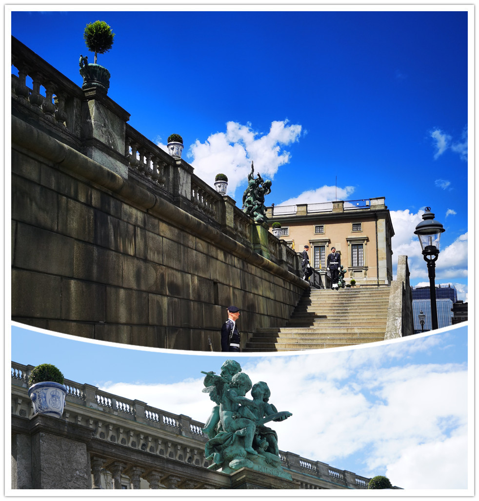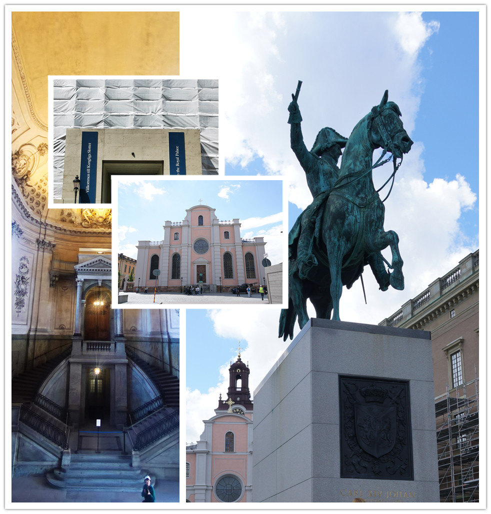 离开老城时回头看,通往老城的路是一段斜坡,正面是古斯塔夫二世国王的雕像(下图右),雕像后面是斯德哥尔摩大教堂(下图中心),右边是正在修缮门面的瑞典皇宫(下图左)。