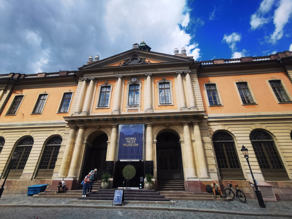 古老的喷泉对面有一幢雄伟的大厦,诺贝尔奖博物馆,我进去一看,一楼为艺术展,二楼才展示了诺贝尔奖介绍、历史回顾、诺贝尔奖得主和诺贝尔生平的资讯等等。我们没有计划入内参观,我只能紧跟大部队,不上楼了哦!留点遗憾,下次再来,呵呵~